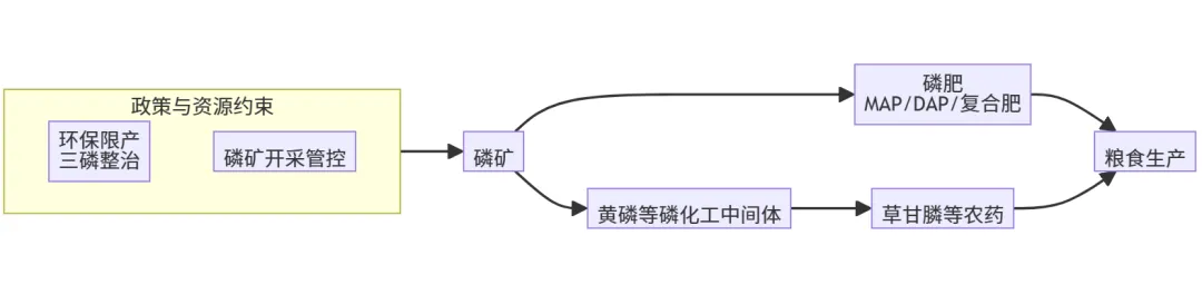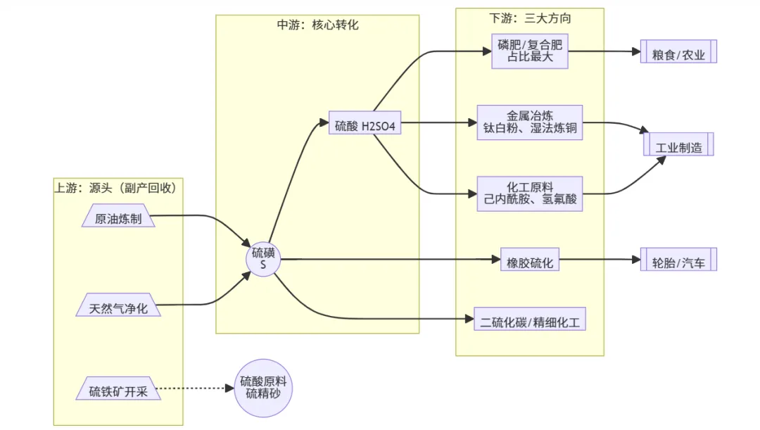 逻辑链条:硫磺 → 硫酸 → 磷肥 → 粮食