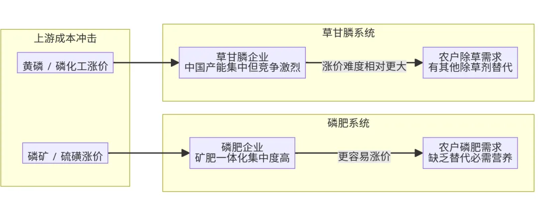 草甘膦,因为草甘膦也是要“吃”磷矿的。但草甘膦却不想磷肥那样“刚需”它是有替代品的。用一张图概括两者的“价格传导能力”