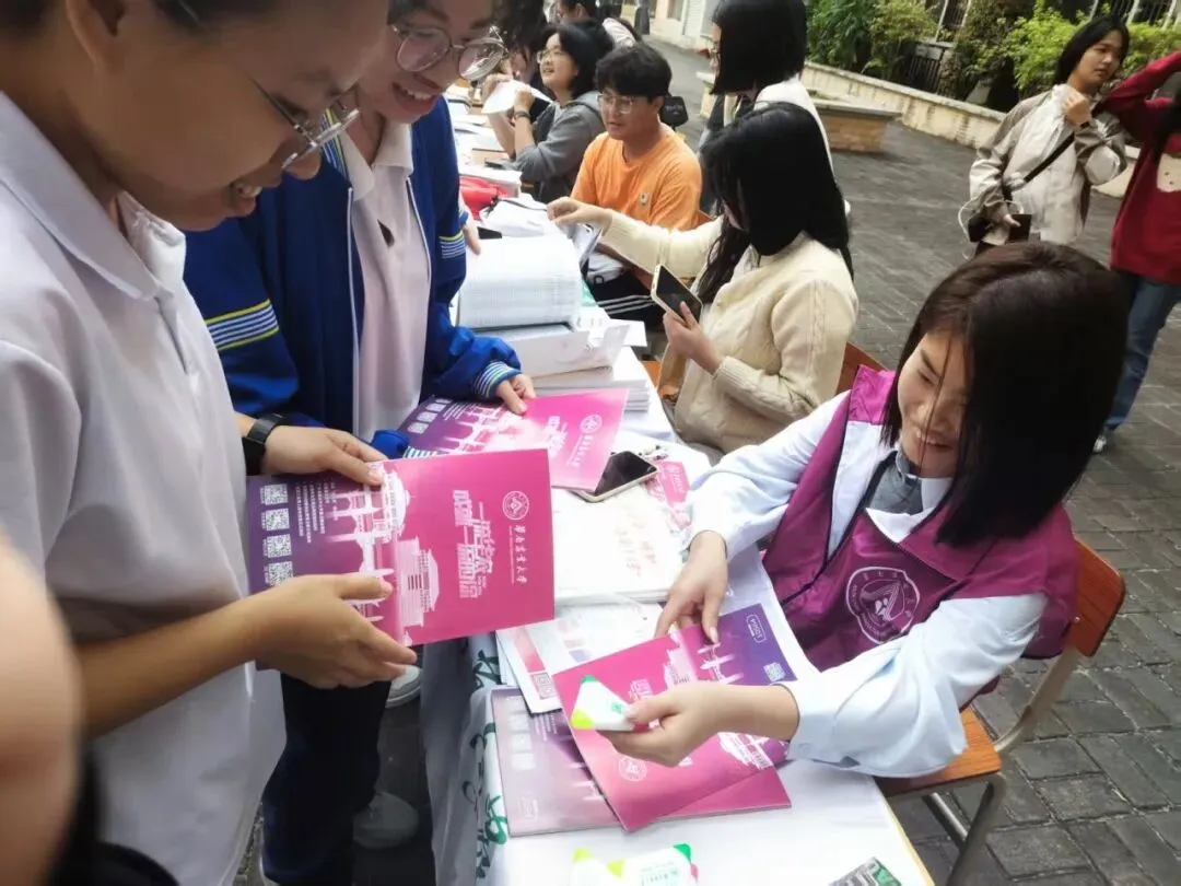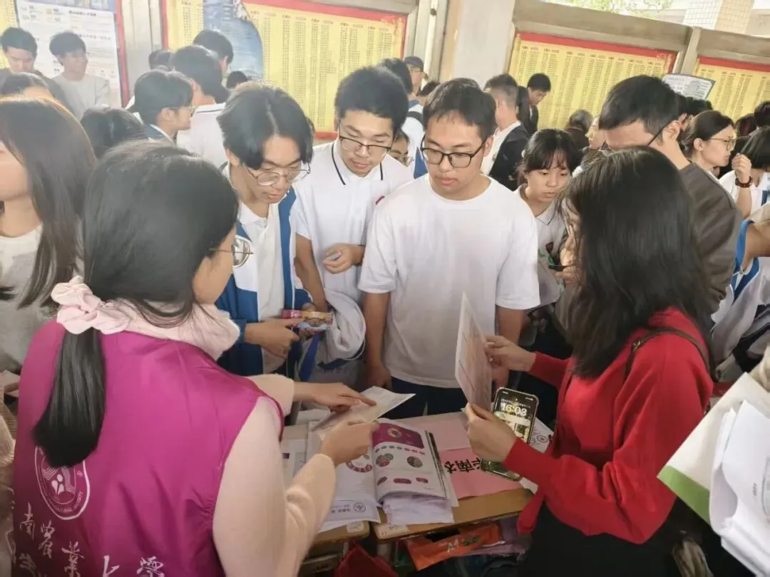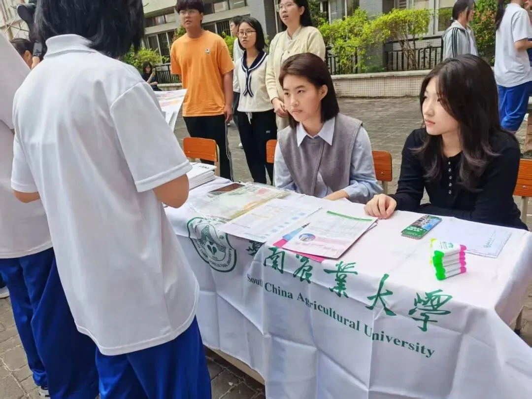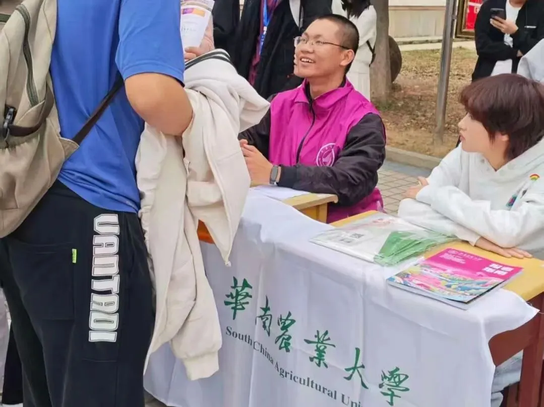 团队从华农百年的红墙绿瓦讲起,介绍农学、动物医学等特色专业,也描绘着校园食堂的烟火、宠物嘉年华的热闹,还有紫荆花道上的青春故事。团队成员不仅带来了历年分数线的理性分析,更分享了填报志愿的暖心建议。摊前很快围满了带着好奇与憧憬的面孔,团队成员以过来人的身份,把自己在高考备考时的迷茫与突破、华农的成长故事,都化作接地气的语言,一一回应。