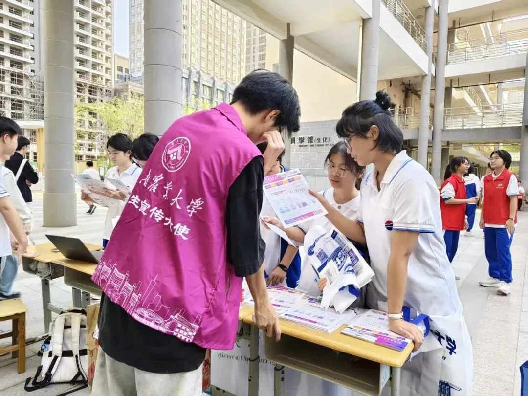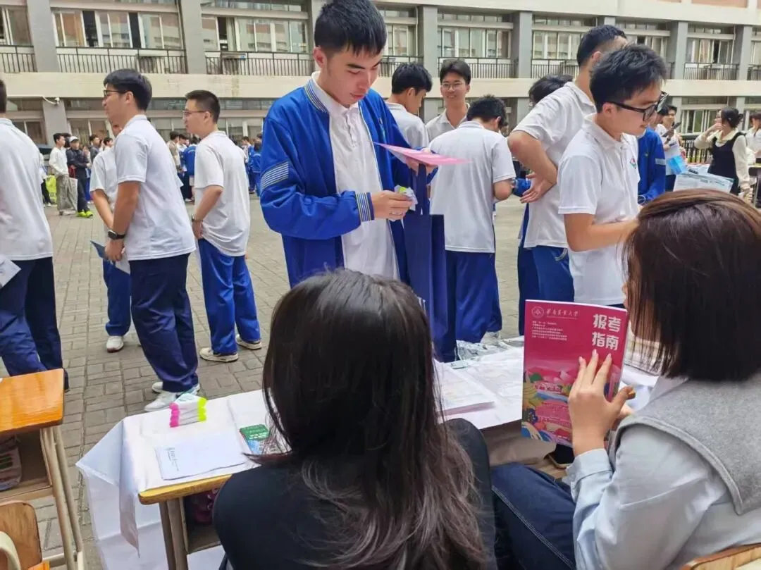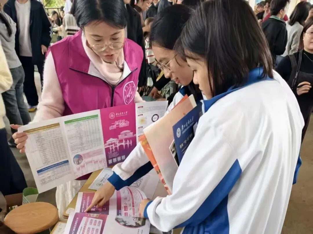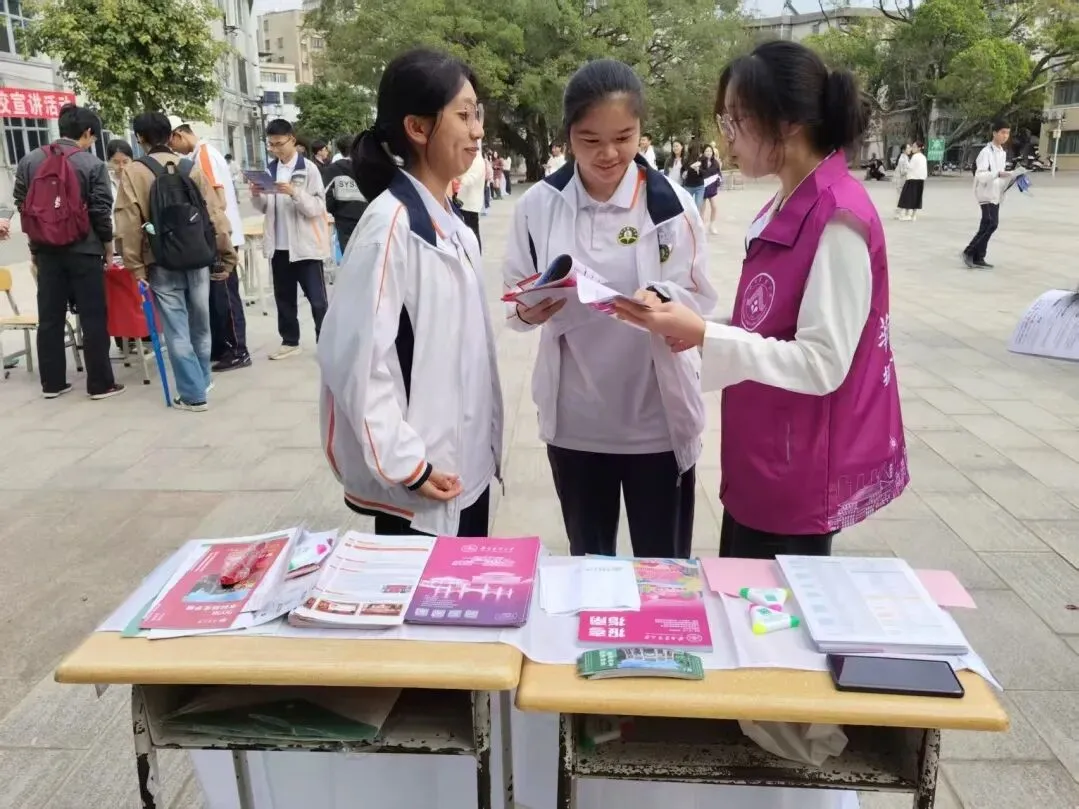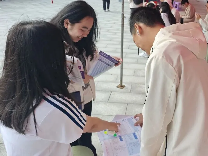 团队从华农百年的红墙绿瓦讲起,介绍农学、动物医学等特色专业,也描绘着校园食堂的烟火、宠物嘉年华的热闹,还有紫荆花道上的青春故事。团队成员不仅带来了历年分数线的理性分析,更分享了填报志愿的暖心建议。摊前很快围满了带着好奇与憧憬的面孔,团队成员以过来人的身份,把自己在高考备考时的迷茫与突破、华农的成长故事,都化作接地气的语言,一一回应。