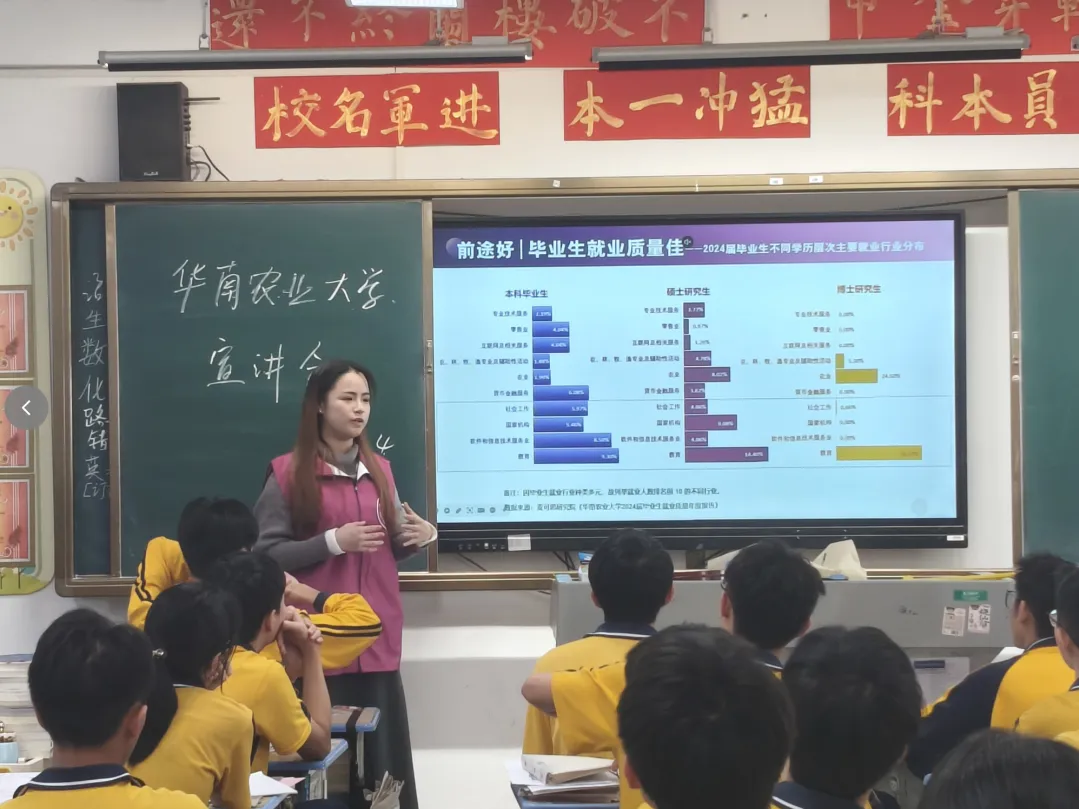 2月4日,谢映虹作为招生宣传大使,与团队成员郑黎儿、廖锡乐一起回到母校廉江市实验学校,开展线下寒招宣传活动。班级宣讲环节,团队以精美PPT为载体,结合自身在华农的学习生活经历,系统介绍华农深厚的历史底蕴、强劲的学科实力,打破大家对农业院校的固有印象。宣讲最后,团队成员详细解读华农历年录取分数线、志愿填报技巧与报考注意事项,并邀请有意向的同学加入招生咨询群,搭建长期沟通交流的平台。