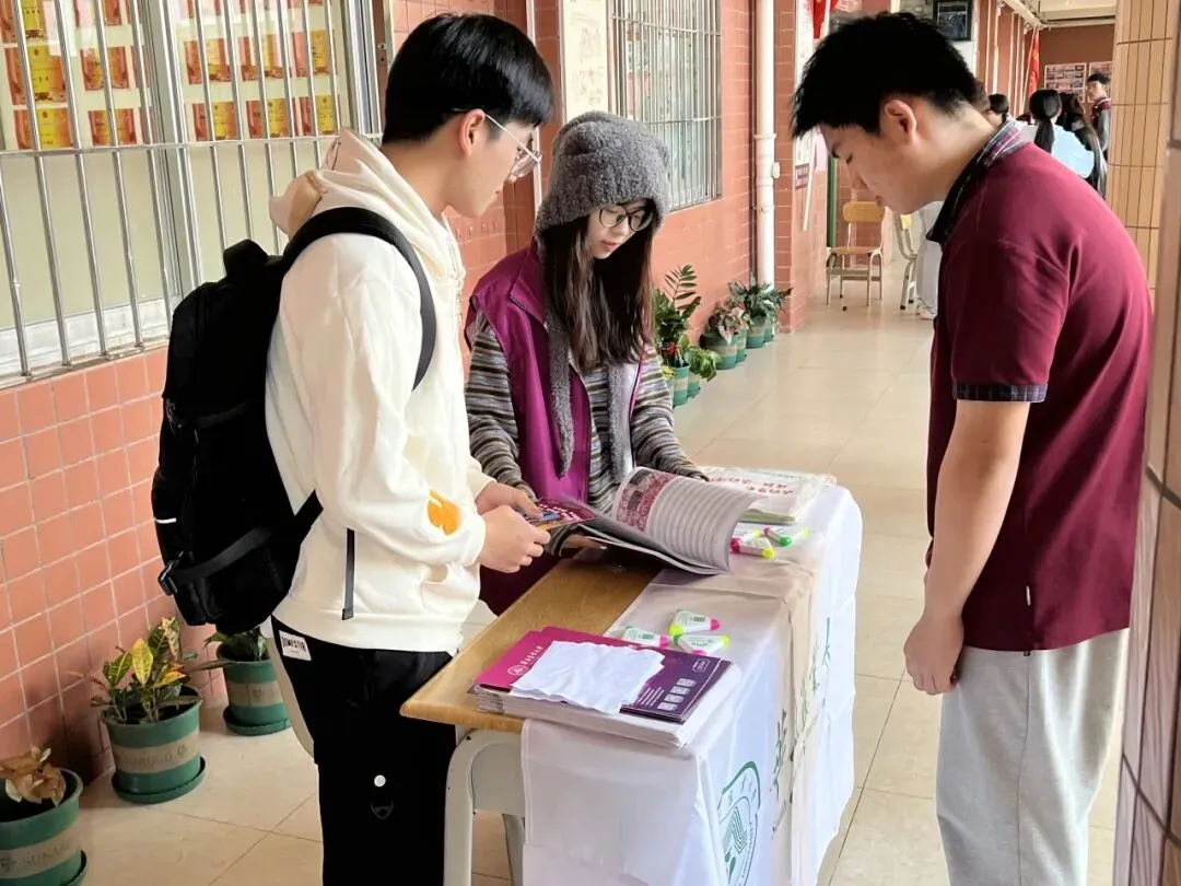 1月31日,蒋生迪作为招生宣传大使,与团队成员官碧桂、余舒媚一起回到母校湛江市实验中学,开展线下寒招宣传活动。团队采用“校园摆摊”的形式,从华农历史底蕴、学科优势、特色专业、校园文化生活、食宿环境,到历年录取分数线、报考注意事项等方面,向学弟学妹们展开详细介绍。