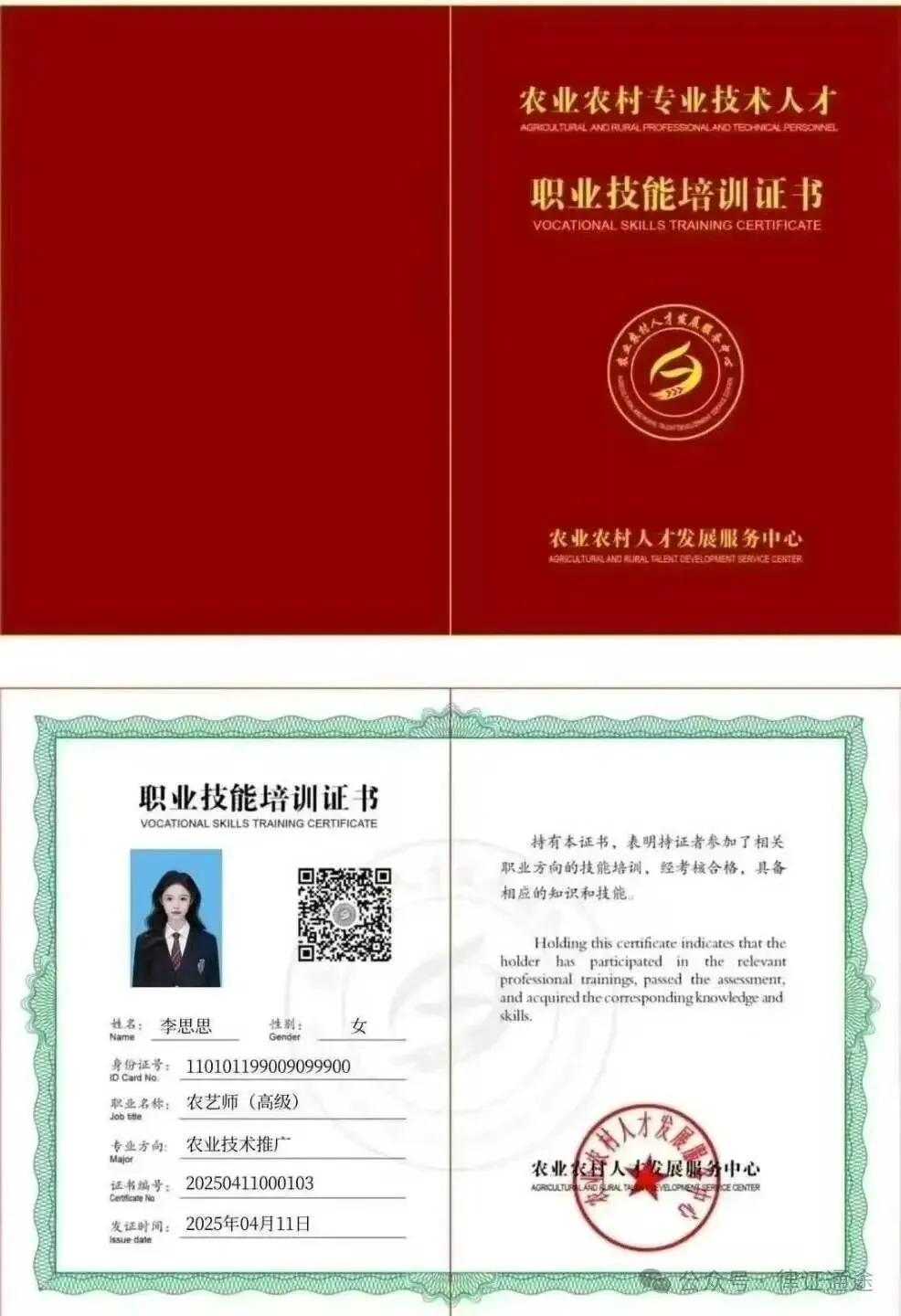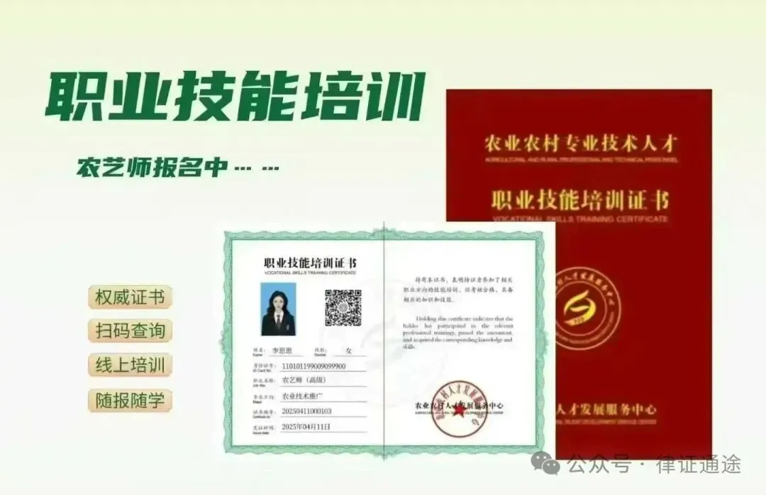 农业农村专业技术人才职业技能培训证书,是线上培训和线上考试的权威认证。该证书全国通用,为上岗就业和晋职考核提供有力支持。