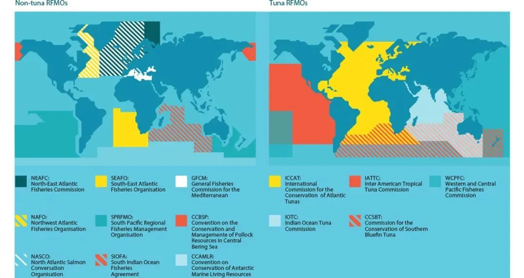 RFMO(Regional Fisheries Management Organizations,区域渔业管理组织),即国际上负责公海及跨界鱼类资源养护与管理的政府间组织(中文常译为“区域渔业管理组织”)。全球约有17个RFMO,其中5个专注金枪鱼类(tuna RFMOs),其余覆盖特定海域或鱼种。中国作为重要远洋渔业国,是WCPFC、IOTC、SPRFMO、ICCAT等多个RFMO的成员/合作方。