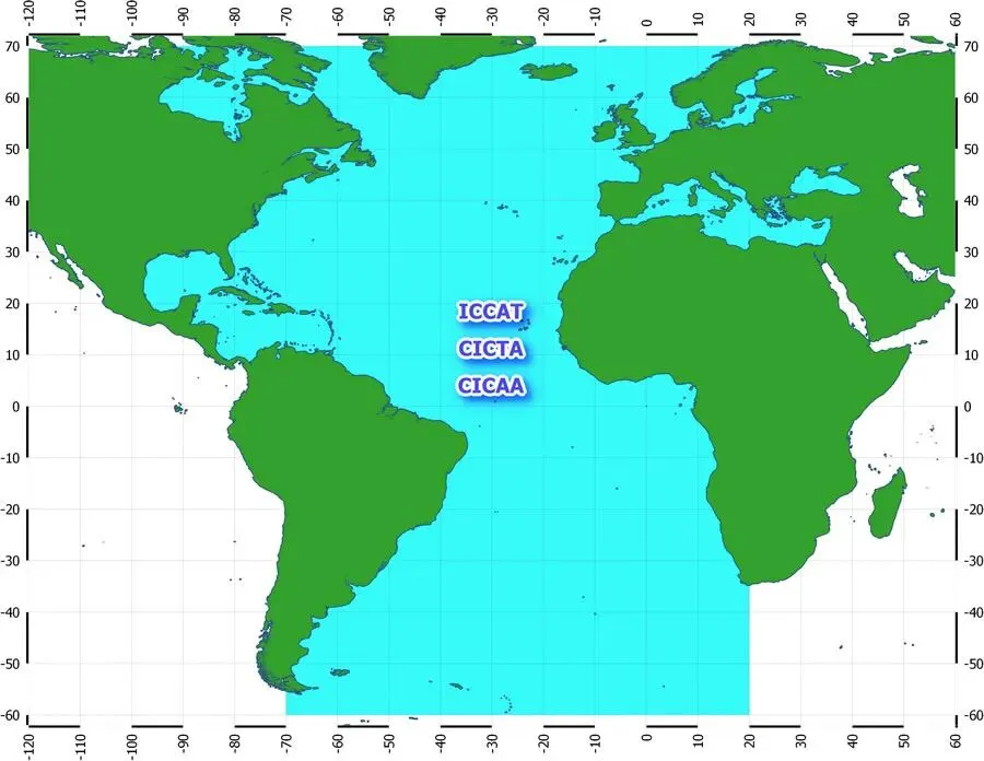 ICCAT公约区官方地图(大西洋蓝色区域为管辖范围,来源:Sargasso Sea Commission/ICCAT官方资料,精确显示大西洋全域边界)。
