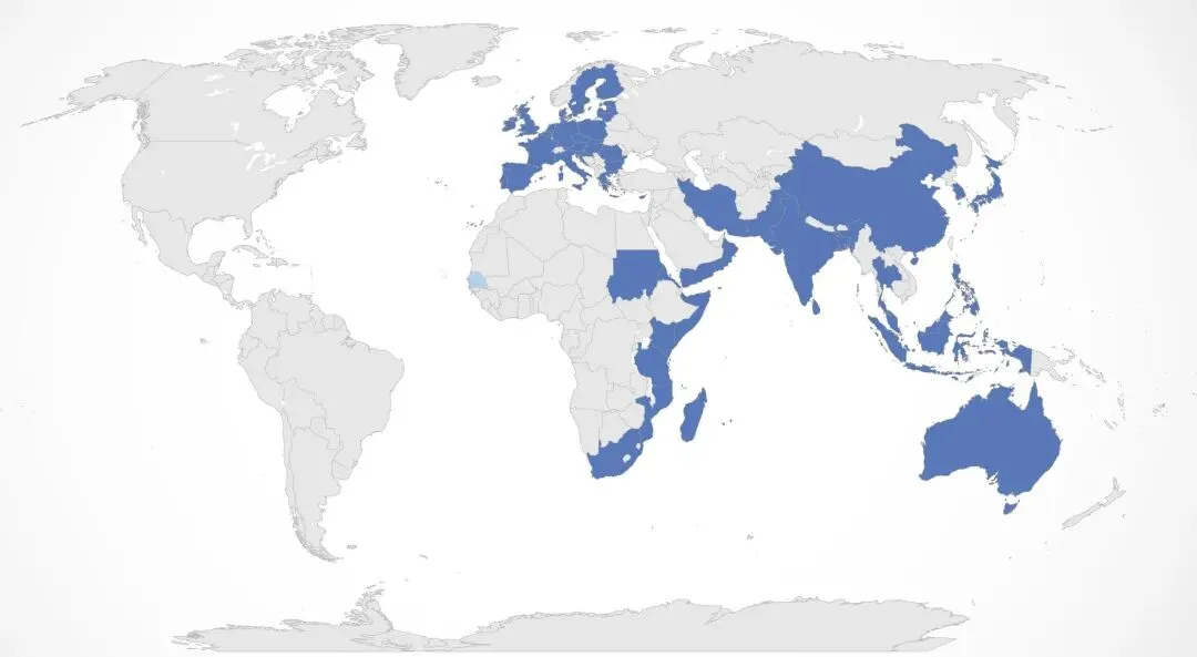IOTC成员国与管辖区域示意图(蓝色为成员覆盖范围,准确反映印度洋核心区与成员分布)。