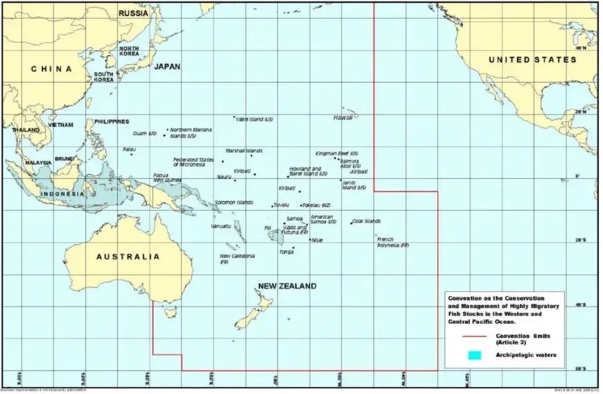 WCPFC公约区官方地图(红色边界为管辖范围,来源:WCPFC官网,精确覆盖中西太平洋公海与成员区)。