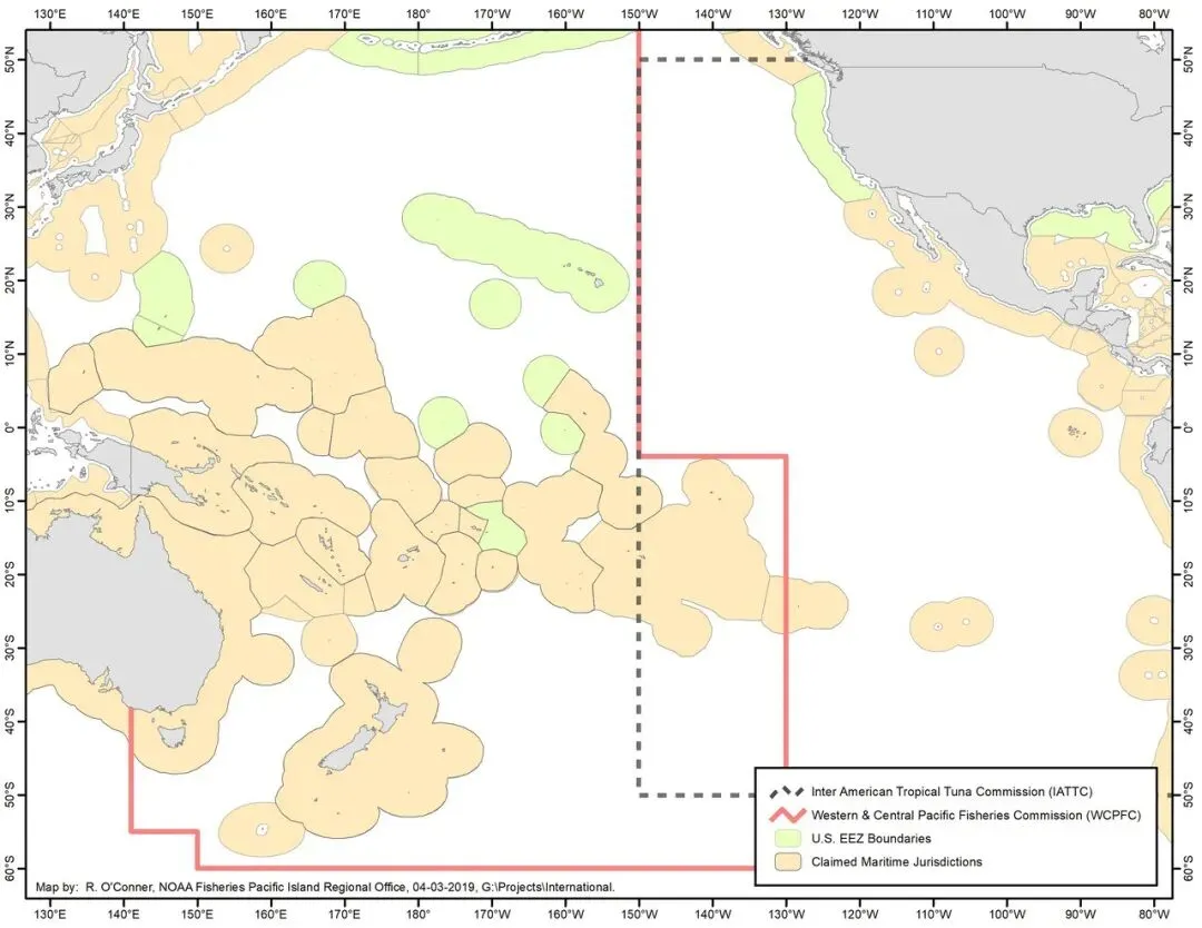 WCPFC与IATTC重叠区对比地图(NOAA官方出品,精确显示中西太平洋边界与美国EEZ及重叠管理区域)。