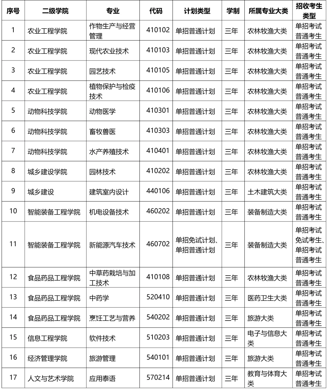 广西农业职业技术大学2026年职教高考单招招生专业