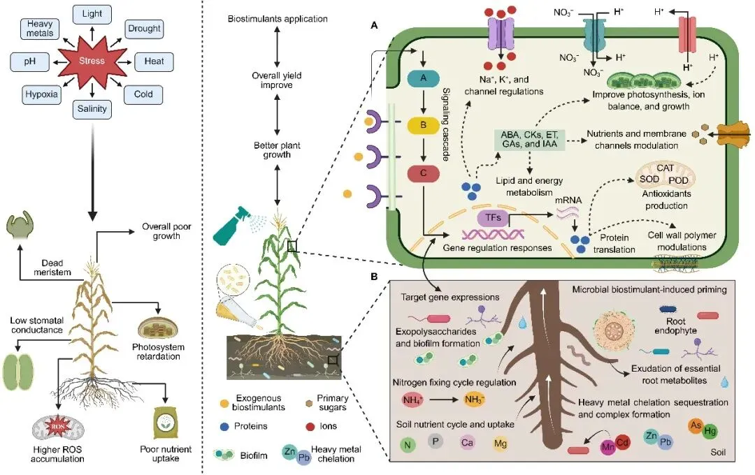 全球气候变化加剧了干旱、高温、盐碱、涝渍和重金属等非生物胁迫对农业生产的影响,严重威胁联合国可持续发展目标“零饥饿”的实现。在这一背景下,如何在减少化学投入的同时提升作物对环境逆境的适应能力,已成为农业科学领域亟待解决的核心问题。生物刺激素作为一种区别于传统肥料和植物生长调节剂的新型农用投入品,正以其独特的调控机制和绿色安全的特性,成为提升作物抗逆性的重要策略。然而,尽管生物刺激素的应用效果已被广泛证实,其背后的分子机制仍缺乏系统梳理,这限制了从经验施用向精准设计的跨越。