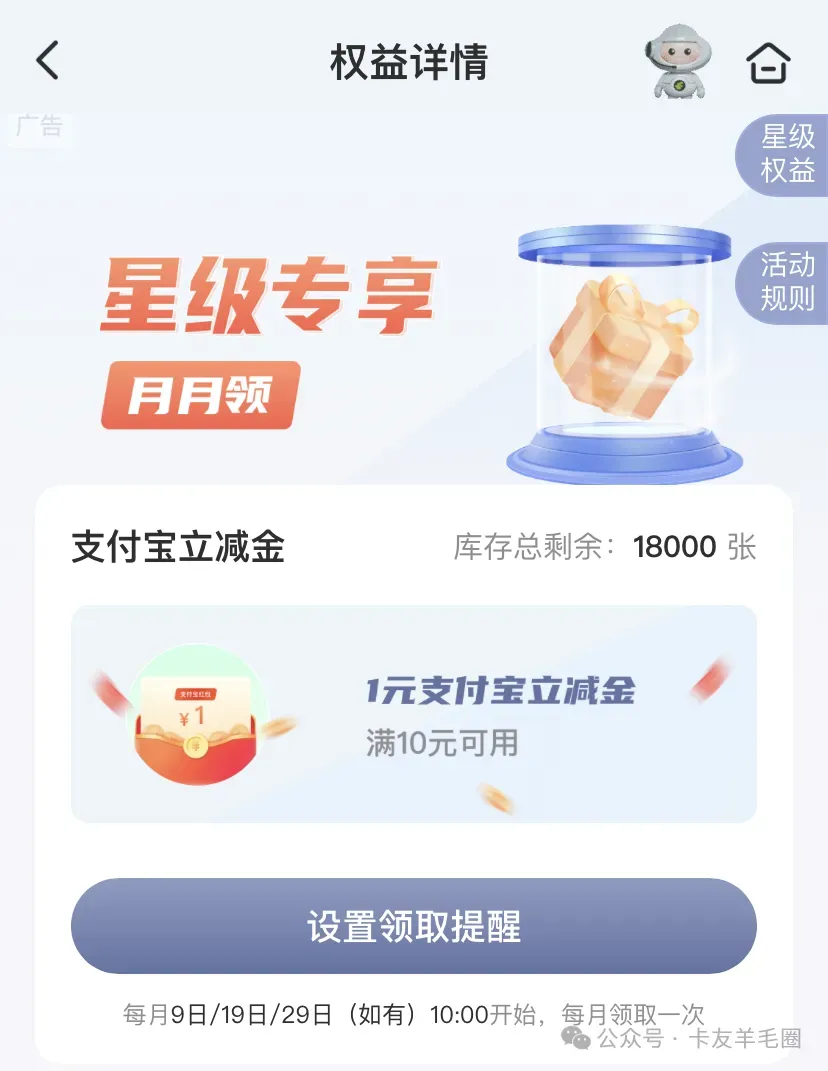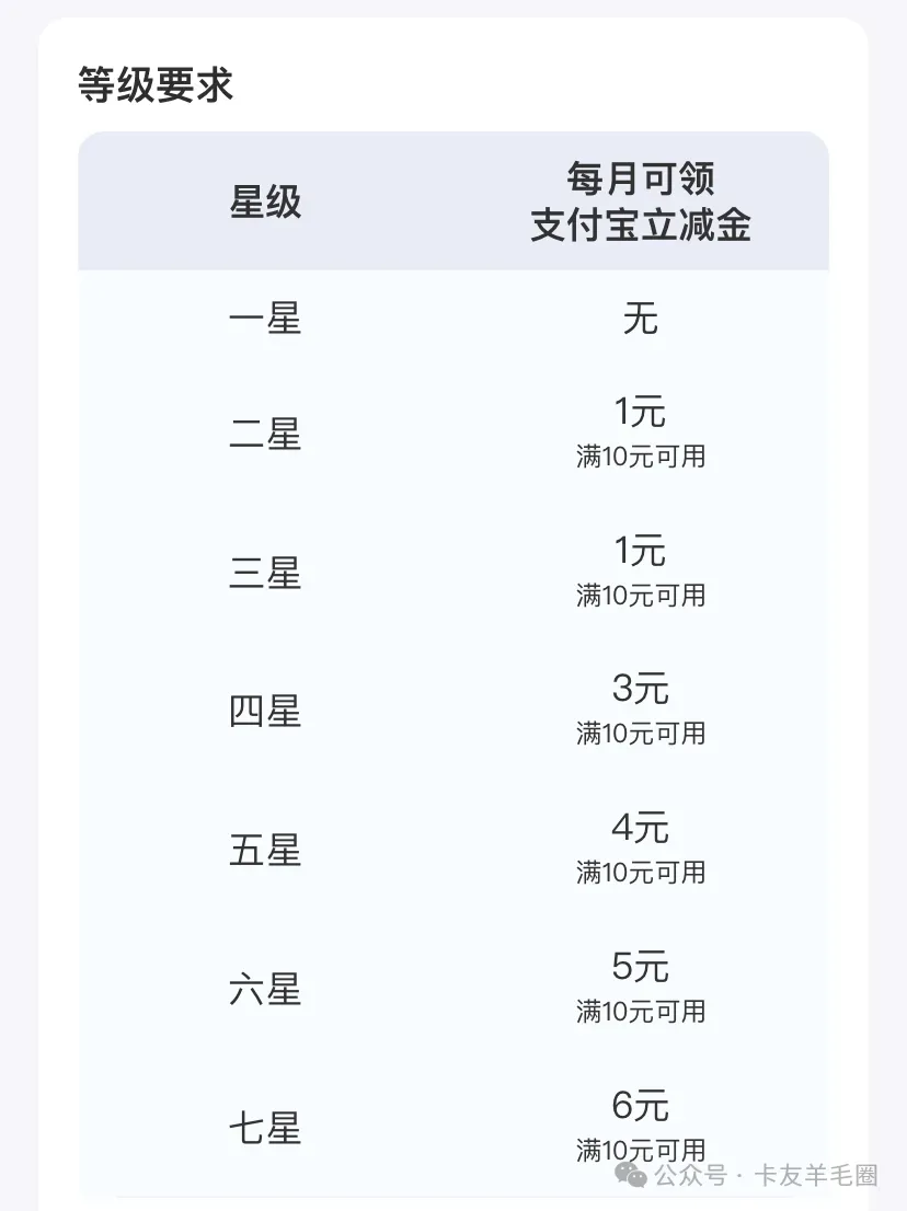 活动内容:活动期间二星至七星级客户有机会在手机银行权益专区领取支付宝立减金(满10元可用)权益,每人每月限领一次。权益数量有限,先到先得,领完为止。
