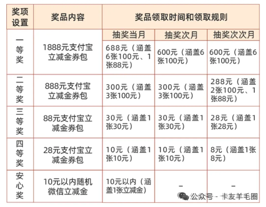 活动内容:活动期间,持卡人可随机抽取1份奖品,中奖情况以农行后台系统显示为准。奖池如下:周周开盲盒(1月)-快捷支付2倍积分券(50000份,额外赠送上限5000积分);周周开盲盒(1月)-0.6元刷卡金券(99670份);周周开盒(1月)-66元刷卡金券(300份);周周开盒(1月)-666元刷卡金券(30份)