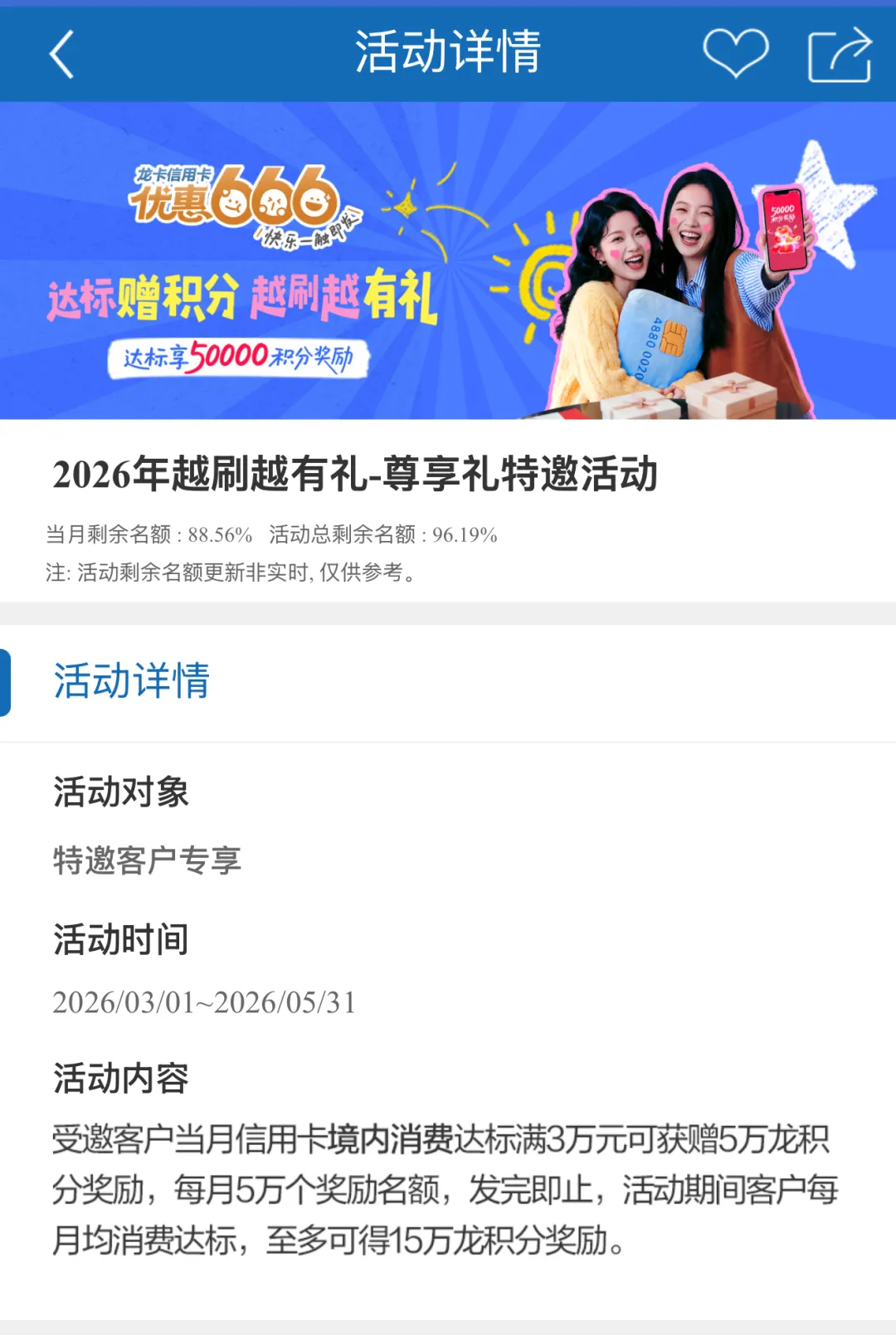 活动时间:2026年3月1日至2026年3月31日活动内容:活动期间,受邀客户当月信用卡境内消费达标满3万元可获赠5万龙积分奖励,每月5万个奖励名额,发完即止,活动期间客户每月均消费达标,至多可得15万龙积分奖励。。