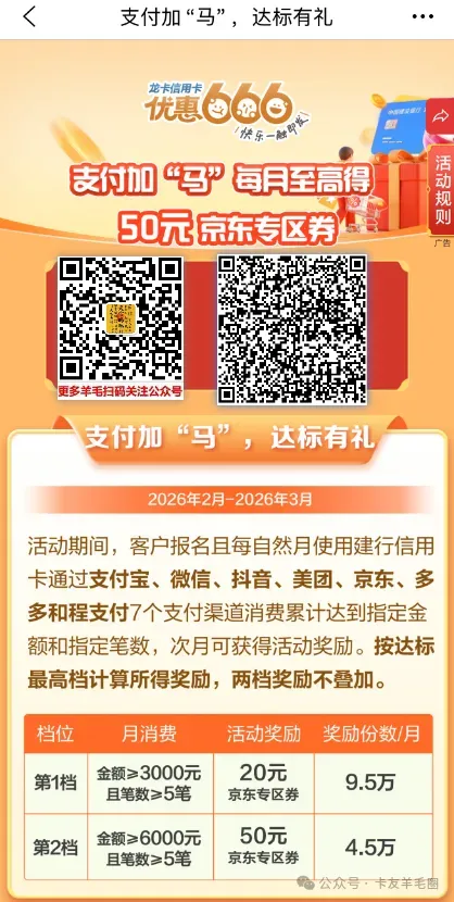 活动时间:2026年3月1日至2026年3月31日活动内容:活动期间,客户报名且使用建行信用卡通过支付宝、微信、抖音、美团、京东、多多和程支付7个支付渠道消费累计达到指定金额,次月可领取活动奖励。