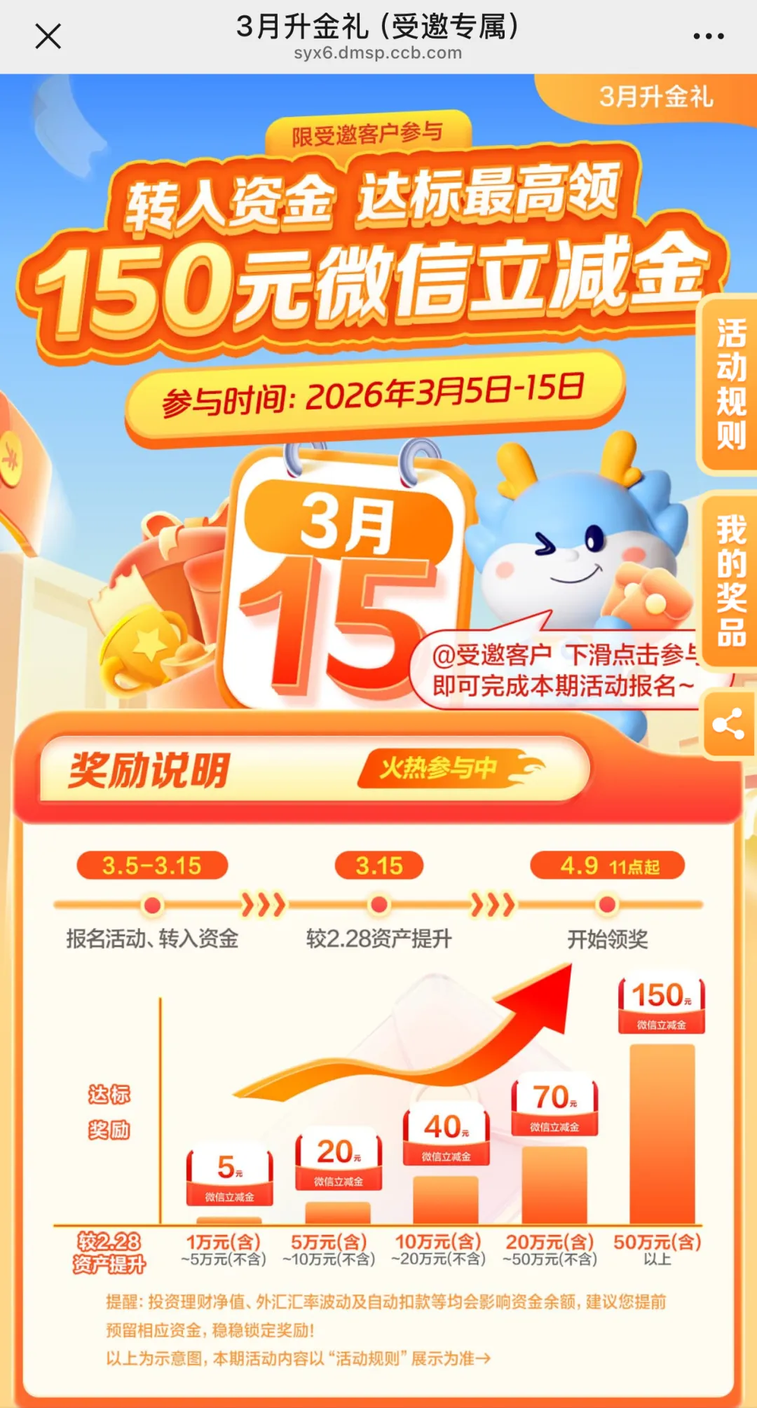 活动时间:2026年3月5日至2026年3月15日活动内容:3月5日至15日报名;3月15日日终资产相较于2月28日日终资产提升相应档位获得对应档位的微信立减金(最高150元立减金)