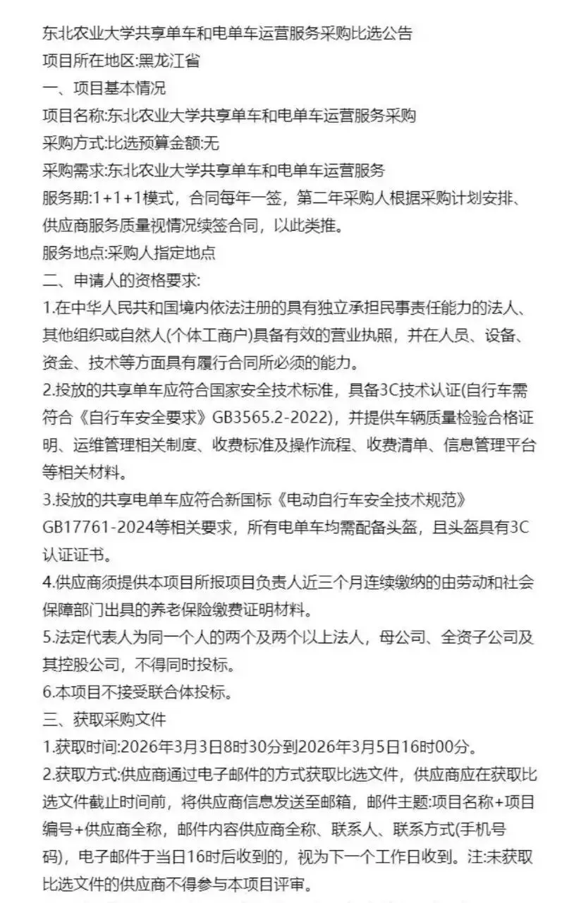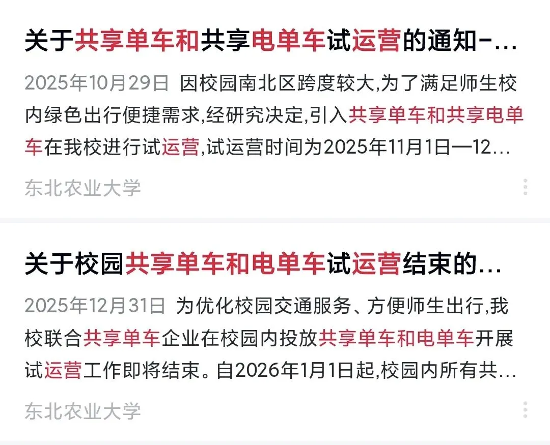 就在近日,我们检索发现👇东北农业大学共享单车运营服务采购相关公告!所以…是不是