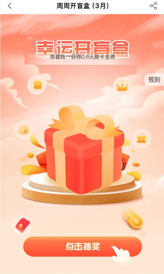 活动内容:活动期间,持卡人可随机抽取1份奖品,中奖情况以农行后台系统显示为准。奖池如下:周周开盲盒(1月)-快捷支付2倍积分券(50000份,额外赠送上限5000积分);周周开盲盒(1月)-0.6元刷卡金券(99670份);周周开盒(1月)-66元刷卡金券(300份);周周开盒(1月)-666元刷卡金券(30份)(新上小动物,app内上线扫码功能,刷卡抽红包(必中)10-500,五年没涨价)