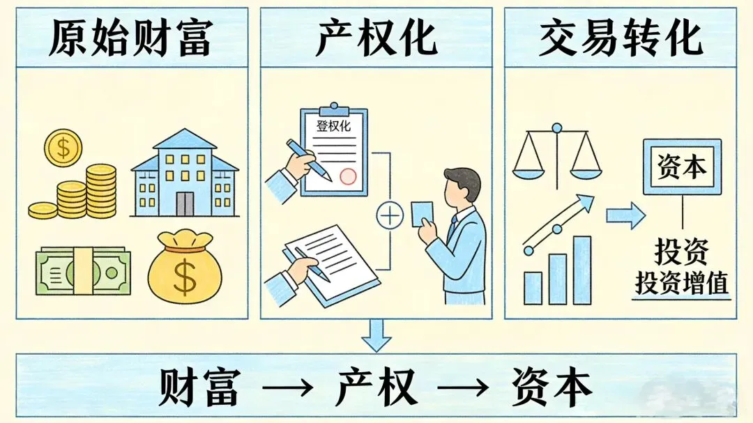 财富要变成资本,必须先完成“产权化”:产权的范围和归属要清晰,并且这些产权必须可以通过票据化的形式自由交易、流通起来。只有这样,静态的财富才能被激活,成为推动经济增长的资本。