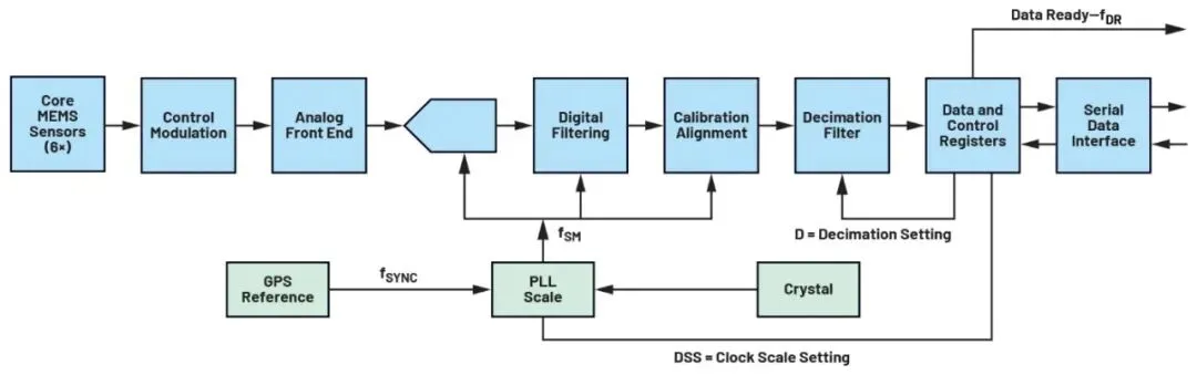 在陀螺仪中,VRE会导致偏置发生快速且持续的变化,从而产生错误的运动校正行为,在最坏情况下甚至会造成平台不稳定。上一代器件在8g rms下的VRE响应可能超过300°/h,而ADIS16576的响应为12°/h,因此其它系统检测模式的估计/校正负担得以大大减轻。ADIS16576最重要的功能改进之一是可变的外部同步。通过引入用户可编程的时钟功能,系统开发者现在可以使用较慢的系统级参考(例如GPS或视频同步)来驱动4000 Hz IMU数据采样。这既实现了与每秒脉冲数(PPS)或感知检测参考的紧密耦合,又保留了更高数据采样所提供的各种数字处理选项。