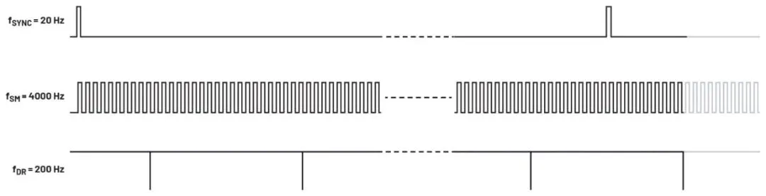 图2和图3是ADIS16576的应用案例,其中自动驾驶汽车平台使用20 Hz GPS参考和200×比例因子来产生4000 Hz的内部采样速率。此外,该系统还展示了如何使用片上抽取滤波器将输出数据速率降为原来的1/20 (200 Hz)。在更富于动态变化的场景中,例如作物巡检无人机在有风条件下作业时,系统处理器可能需要以最大采样速率读取和处理数据,以确保稳定性和操控性。