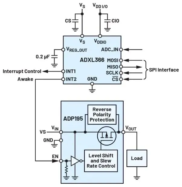 超低功耗MEMS惯性传感器的另一项核心能力是支持物联网节点的系统级电源管理。ADXL366提供专用唤醒模式,能够根据检测到的运动曲线发出中断,进而管理电子系统电源的通断周期。典型配置可参见图4。ADI的MEMS加速度计提供了丰富的可编程参数,不仅能配置所需的运动曲线,最重要的是,还能在全带宽下唤醒和采样。此功能对于避免混叠和误检非常重要。在唤醒模式下,ADXL366的功耗低至惊人的180 nA。利用这一优势,高功耗传感器、无线电及其他元件可以在无需工作时关断,从而延长传感器节点的使用寿命。