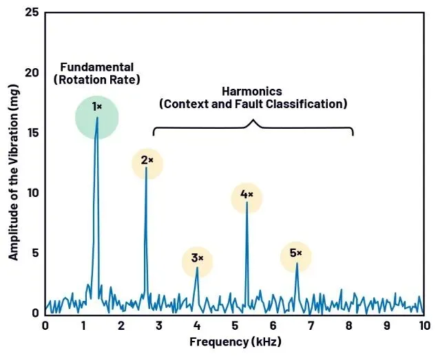 最后要谈的是惯性检测与AI分析的集成方案,集成的目的是在智慧农业领域实现预测性维护。现代农场规模不断扩大,因而不得不依赖高资本支出的机械进行生产。此类设备不仅要精准无误地运行,还必须经受住季节性农耕任务的恶劣环境和高强度作业的考验。在短暂的种植或收获季节中,如果设备发生故障,可能会造成严重的经济损失。例如,播种机或收割机等精密设备,常常需要在风雨、尘土、泥泞、碎石等恶劣环境下作业。在这些环境中,关键振动特征的变化可用于提前预测设备问题,然后在尽量不影响高峰期生产的时间内进行维护来解决问题。机械振动分析(类似于牲畜的生命体征监测)可用于精确定位机械元件中不同问题的故障模式和时间,例如轴承故障、轴未对准、不平衡、松动、齿轮故障和其他问题。假设轴承存在缺陷,如表面剥落或形状偏离理想球体。每当这类缺陷与机器表面接触时,都会在平台上产生一个冲击,从而引发复杂的振动响应,其中既包含基频成分,也包含宽带成分。图5以频谱形式展示了一个复杂的振动曲线。