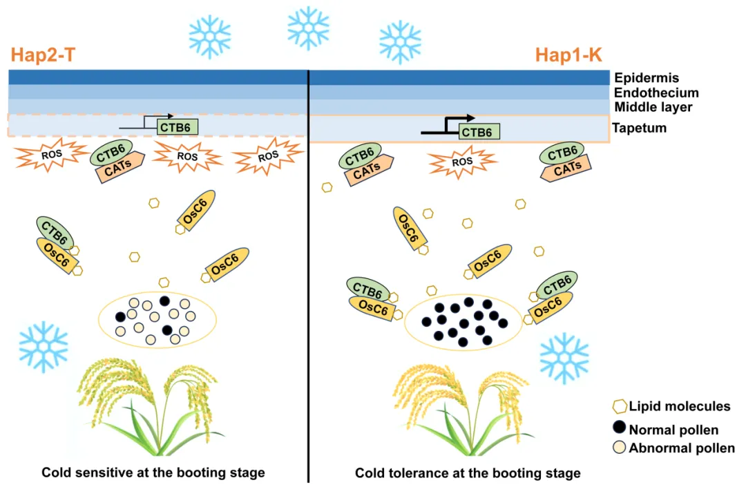 本研究在qCTB10-2定位基础上,克隆了CTB6,其正向调控水稻孕穗期耐冷性。CTB6受冷诱导表达,并在绒毡层和发育早期的小孢子中表达。CTB6与过氧化氢酶(catalase, CAT)CATA互作,在低温胁迫下能够调控绒毡层中ROS的内稳态,保证绒毡层正常的PCD。CTB6的耐冷功能变异位点位于启动子区,包含CTB6优异单倍型的材料主要分布在中国的云贵高原高寒稻作区。研究结果为水稻耐冷育种提供了重要的遗传资源,目前相关研究结果已发表在《Advanced Science》杂志上。