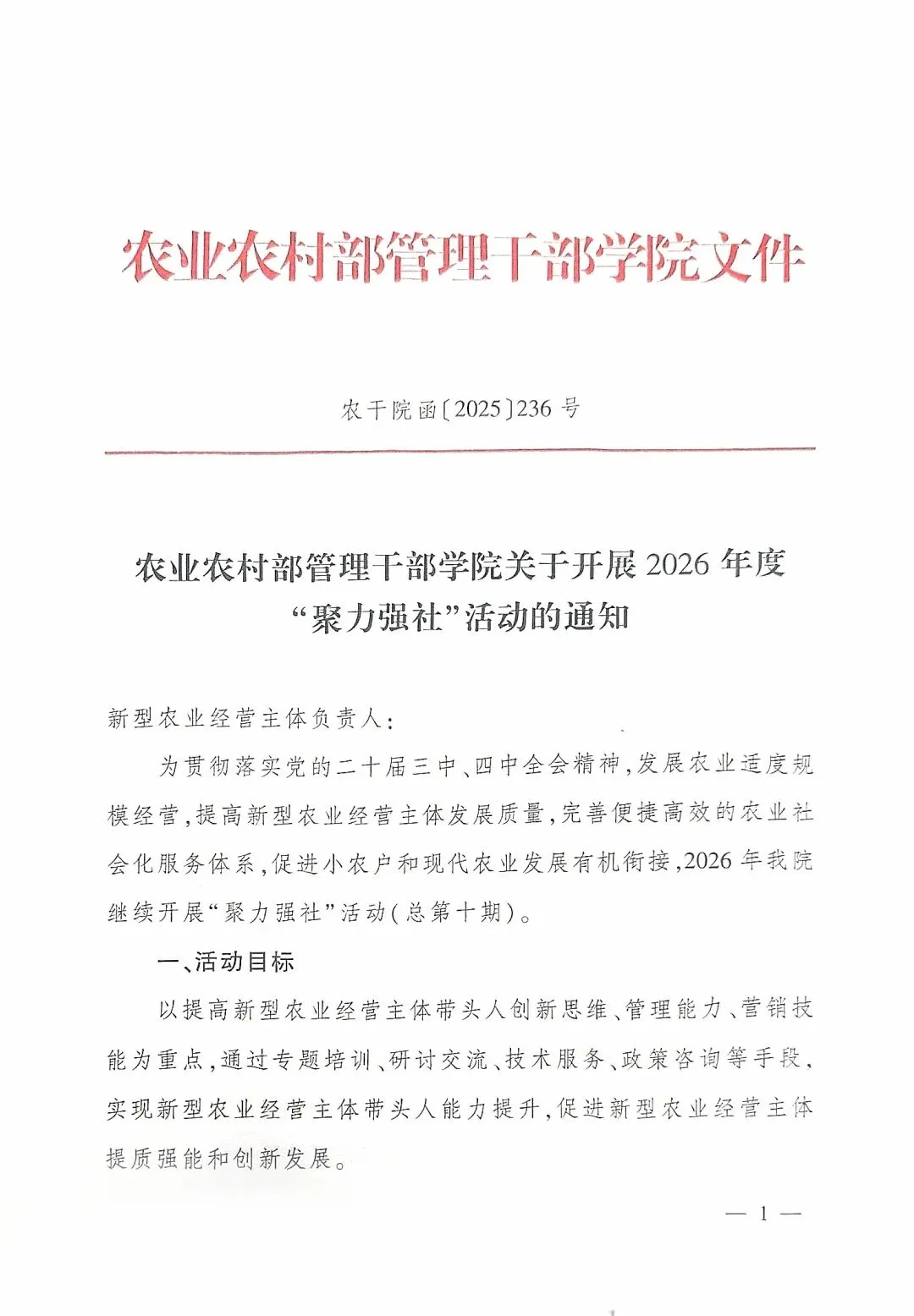 为贯彻落实党的二十届三中、四中全会精神,发展农业适度规模经营,提高新型农业经营主体发展质量,完善便捷高效的农业社会化服务体系,促进小农户和现代农业发展有机衔接,2026年我院继续开展“聚力强社”活动(总第十期)。