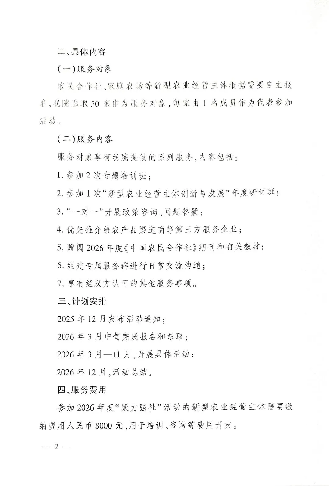 参加2026年度“聚力强社”活动的新型农业经营主体需要缴纳费用人民币8000元,用于培训、咨询等费用开支。