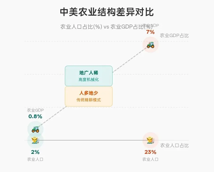 然而,光鲜的总量背后,是亟待优化的产业结构与生产效率。一个关键指标是农业就业人口占比。当前,中国农业GDP占比约为7%,但农业人口占比仍高达23%。相比之下,美国农业GDP占比仅约0.84%,农业人口占比则低至2%。这意味着,我们用了远超发达国家比例的劳动力,创造了相对其GDP占比更高的农业产值,但人均产出和劳动生产率仍有巨大提升空间。