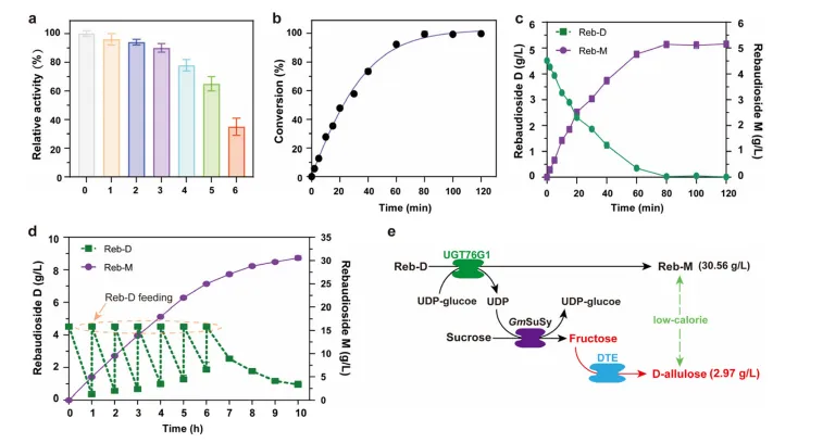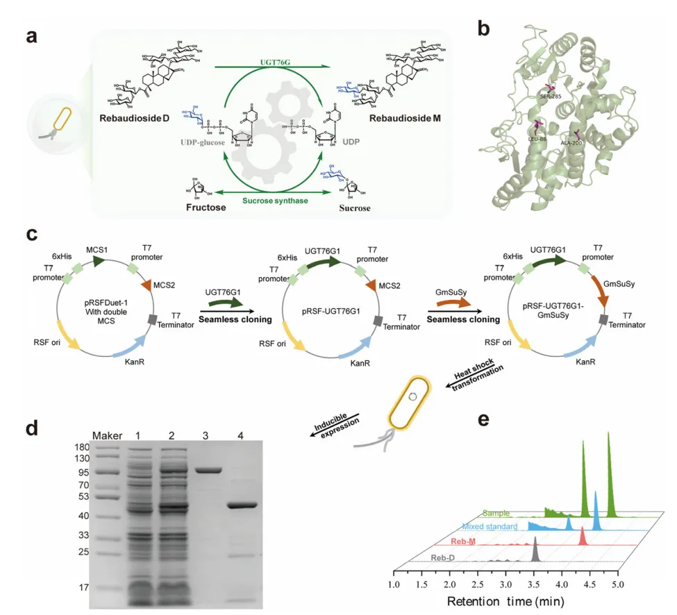 近年来,研究者尝试在大肠杆菌或酵母中从头合成Reb-M前体,但产量仅为毫克/升级,远未达到工业要求。相较而言,以相对丰富的糖苷(如Reb-D)为底物,通过糖基转移酶(UGT)进行体外酶法或全细胞转化更具可行性。其中,UGT76G1可催化UDP-葡萄糖(UDP-Glc)向Reb-D的C3-羟基转移生成Reb-M。然而,该路线仍存在四大瓶颈:①植物源UGT76G1在微生物中表达易形成包涵体,可溶性差;②UDP-Glc作为昂贵辅因子,需经济高效的再生体系;③现有研究多集中于酶工程改造,对整体过程优化关注不足;④糖基化反应中会释放等摩尔的果糖副产物,传统工艺未加利用,造成原子浪费。