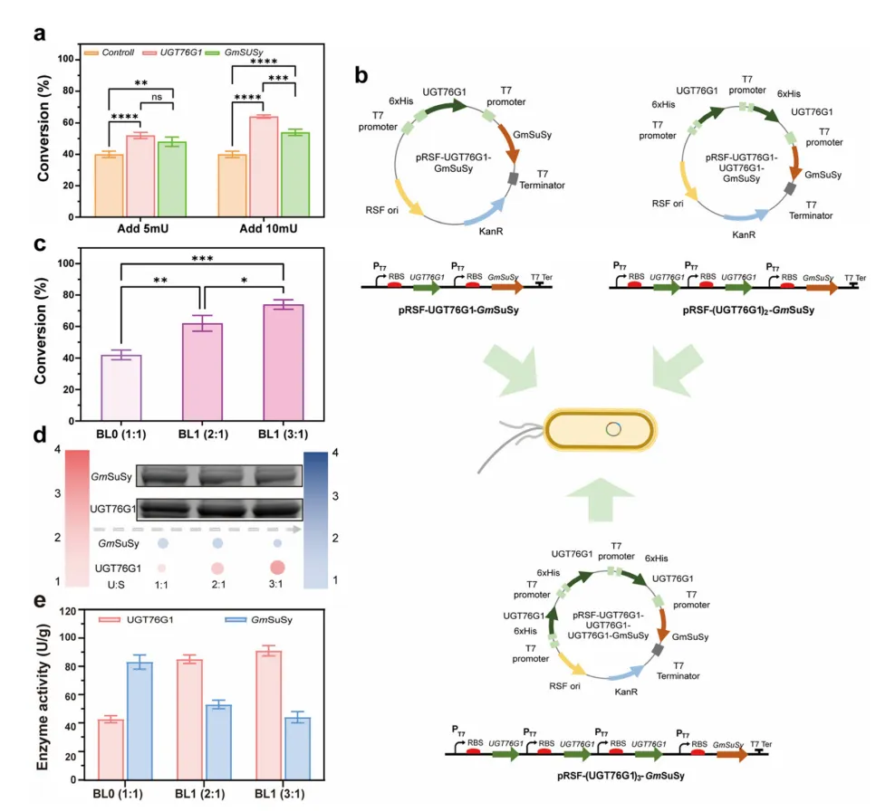 粗酶液补充实验显示UGT76G1为限速步骤,因此通过增加UGT76G1基因拷贝数构建菌株BL1(2:1)和BL2(3:1)。随着拷贝数增加,UGT76G1可溶性表达分别提高17%和41%,酶活从45 U/g升至92 U/g,Reb-D转化率从42.55%升至73.63%。但GmSuSy表达因资源竞争下降,提示需平衡两酶表达。