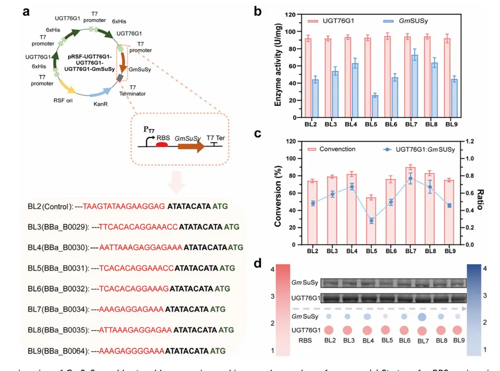 为恢复GmSuSy水平,替换其核糖体结合位点(RBS)为7种不同强度的合成序列,获得菌株BL3–BL9。UGT76G1活性保持稳定(80–95 U/g),GmSuSy活性随RBS强度变化(28–78 U/g)。当两酶活性接近1:1时(BL7,RBS BBa_B0034),转化率最高达85%,较对照提高20%。RBS工程实现了翻译水平的定量调控,优化了级联平衡。