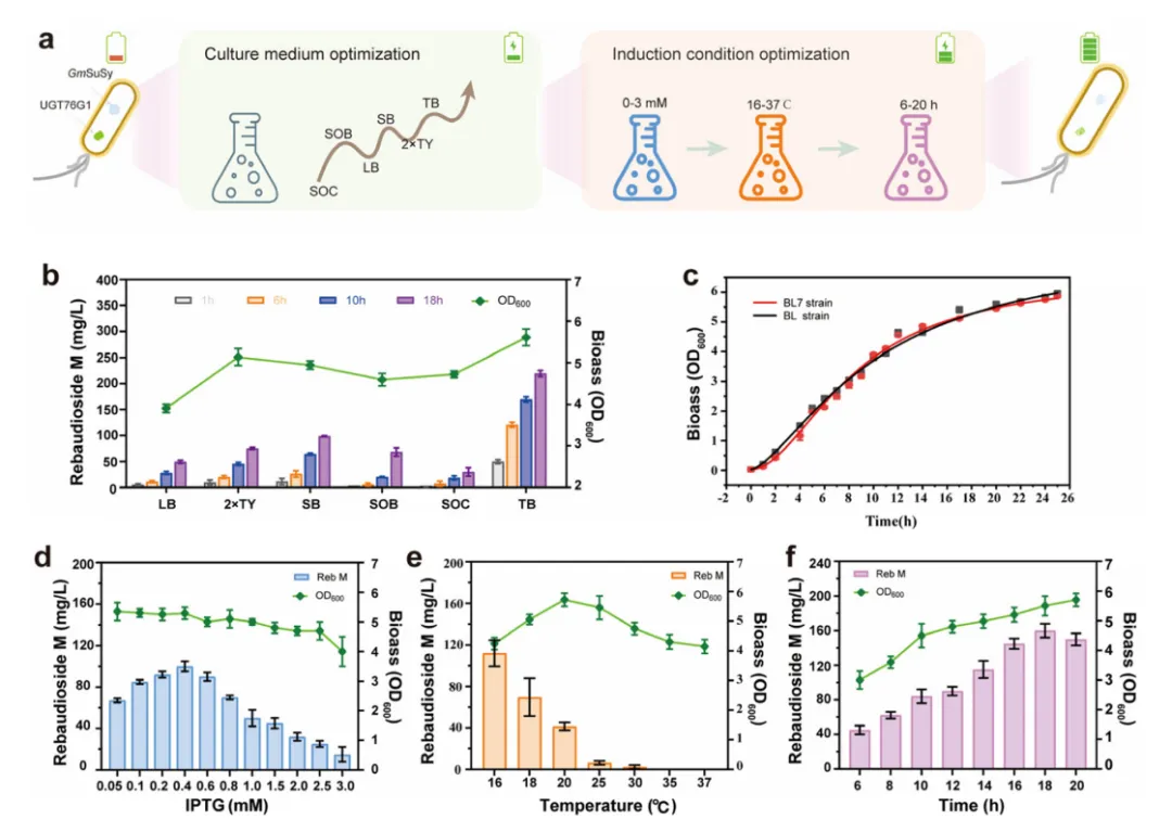 比较6种培养基,TB培养基使Reb-M产量最高(219.55 mg/L),较LB提高4.45倍,且UGT76G1可溶性表达增加,包涵体减少。优化诱导条件:0.4 mM IPTG、16°C诱导18 h,获得最佳生物量与酶活,Reb-M产量达160 mg/L。