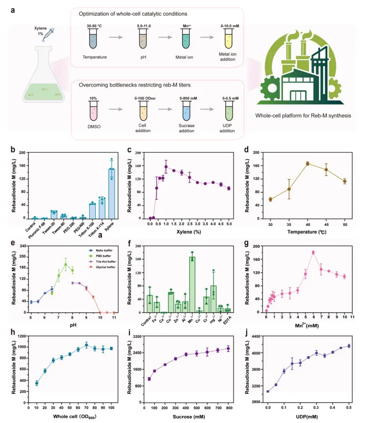 针对全细胞催化中膜传质限制,筛选多种透性化试剂。1%二甲苯处理效果最佳,Reb-M产量从2.53 mg/L升至156.86 mg/L,随后活性因细胞裂解下降。确定1%二甲苯为最优浓度,兼顾通透性与细胞完整性。