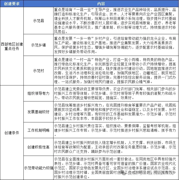 【创建计划】采取先创建后认定方式,每年建设100个左右乡村振兴示范县(由农业农村部认定),1000个左右示范乡(镇)、10000个左右示范村(由省级农业部门认定),聚焦乡村振兴重点任务和薄弱环节,发挥示范引领和要素集聚作用。地方政府性债务风险较高地区不得纳入创建范围。