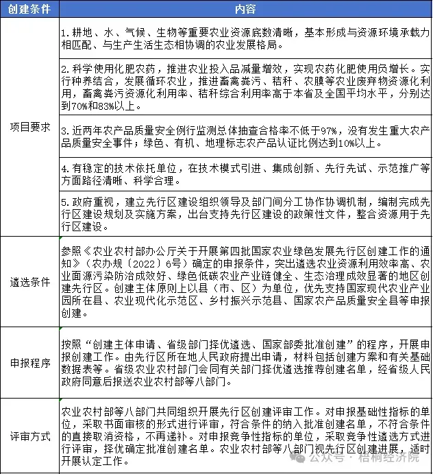 具体创建条件可参照农业农村部办公厅印发《国家农业绿色发展先行区整建制全要素全链条推进农业面源污染综合防治实施方案》(2023年)。