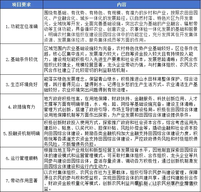 【项目要求】七大必备条件功能定位准确、基础条件较优、生态环境良好、政策措施有力、投融资机制明确、运行管理顺畅、带动作用显著。