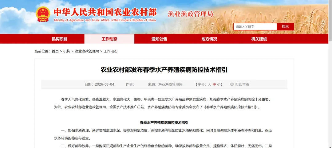 春季天气变化频繁,昼夜温差大,水温变化大,鱼类、甲壳类一些主要水产养殖品种易发生疾病,加强春季水产养殖疾病的防控十分重要。为此,农业农村部渔业渔政管理局、全国水产技术推广总站、水产养殖病害防治专家委员会发布了《春季水产养殖疾病防控技术指引》。