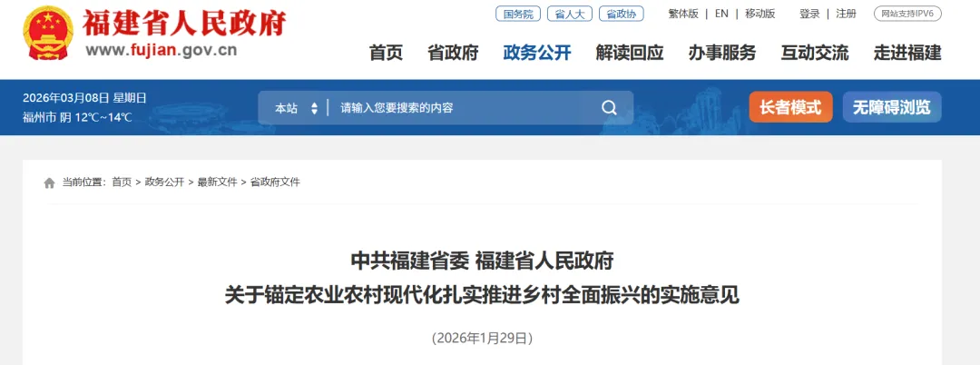 农业农村现代化关系中国式现代化全局和成色。2026年是“十五五”开局之年,做好“三农”工作至关重要。要坚持以习近平新时代中国特色社会主义思想为指导,深入贯彻党的二十大和二十届历次全会精神,全面贯彻习近平总书记关于“三农”工作的重要论述和在福建考察时的重要讲话精神,坚持把解决好“三农”问题作为重中之重,坚持和加强党对“三农”工作的全面领导,完整准确全面贯彻新发展理念,坚持稳中求进工作总基调,坚持农业农村优先发展,坚持以县域为重点推动城乡融合发展,锚定农业农村现代化,以推进乡村全面振兴为总抓手,以学习运用“千万工程”经验为引领,以改革创新为根本动力,提高强农惠农富农政策效能,守牢粮食安全底线,持续巩固拓展脱贫攻坚成果,提升乡村产业发展水平、乡村建设水平、乡村治理水平,努力把农业建成现代化大产业、使农村基本具备现代生活条件、让农民生活更加富裕美好,为奋力开创中国式现代化福建实践新局面作出“三农”贡献。