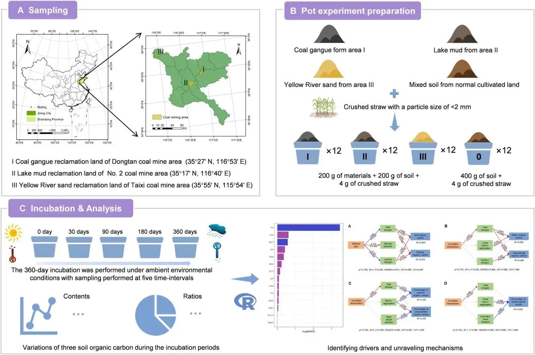 在采矿区土地复垦过程中,非本地物质被引入土壤系统,但这些外来物质对土壤有机碳(SOC)积累的影响仍不清楚。通过一项为期360天的中宇宙实验,比较煤脉石(CG)、湖泥(LM)和黄河砂(YS),我们研究了它们对土壤有机碳及其各组分——惰性有机碳、中间有机碳和活性有机碳——的影响。研究结果表明,CG处理在培养期内展现出更优的土壤有机碳恢复效果,其含量从8.2 g kg⁻¹提升至14.9 g kg⁻¹,显著优于LM和YS处理。在各组分中,POC占主导地位,且CG处理的POC含量(7.0–10.3 g kg⁻¹)持续高于LM和YS处理。结构方程模型分析显示,在CG处理中,较高的全氮含量和碳氮比促进了土壤有机碳与POC的累积(GFI = 0.985, P = 0.255);同时,该处理中更高比例的大团聚体进一步增强了活性有机碳的形成(GFI = 0.988, P = 0.630),从而在土壤有机碳的固持与矿化之间建立了有效平衡。此外,温度升高通过提升活性有机碳和中间有机碳含量、降低POC占比,降低了土壤有机碳的稳定性(GFI = 0.987, P = 0.426)。这些发现为理解复垦土壤的碳固存动态提供了重要基础,并为矿区土壤复垦中优先选择外源物料提供了科学依据。