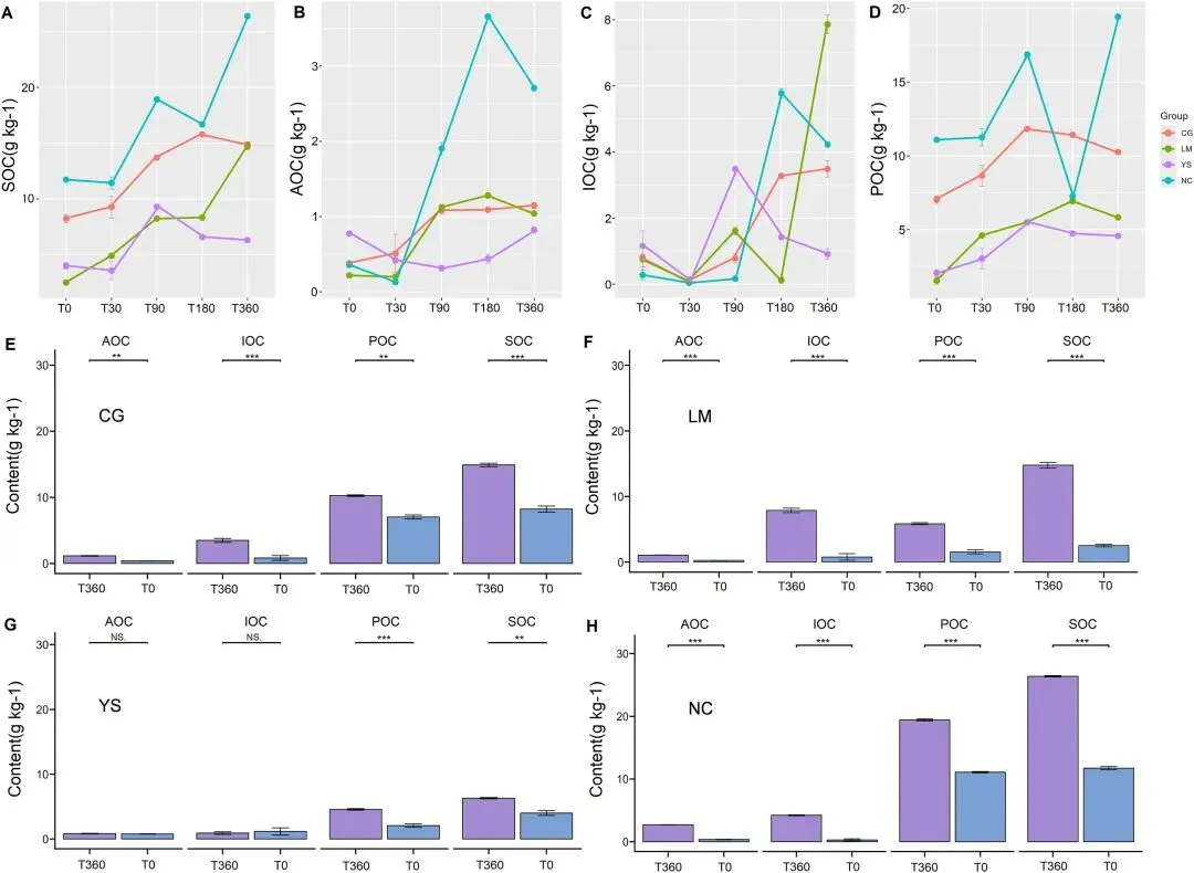 图2.土壤有机碳及不同培养阶段不同处理的有机碳组分。A–D 培养0、30、90、180和360天时四种处理的SOC、AOC、IOC及POC含量。E–H CG、LM、YS及NC处理在培养前后SOC、AOC、IOC及POC含量的变化。** 表示在 P<0.01P<0.01 水平差异显著,*** 表示在 P<0.001P<0.001 水平差异显著。缩写: SOC:土壤有机碳;AOC:活性有机碳;IOC:中间有机碳;POC:惰性有机碳;CG:煤矸石;LM:湖泥;YS:黄河沙;NC:常规耕作土壤