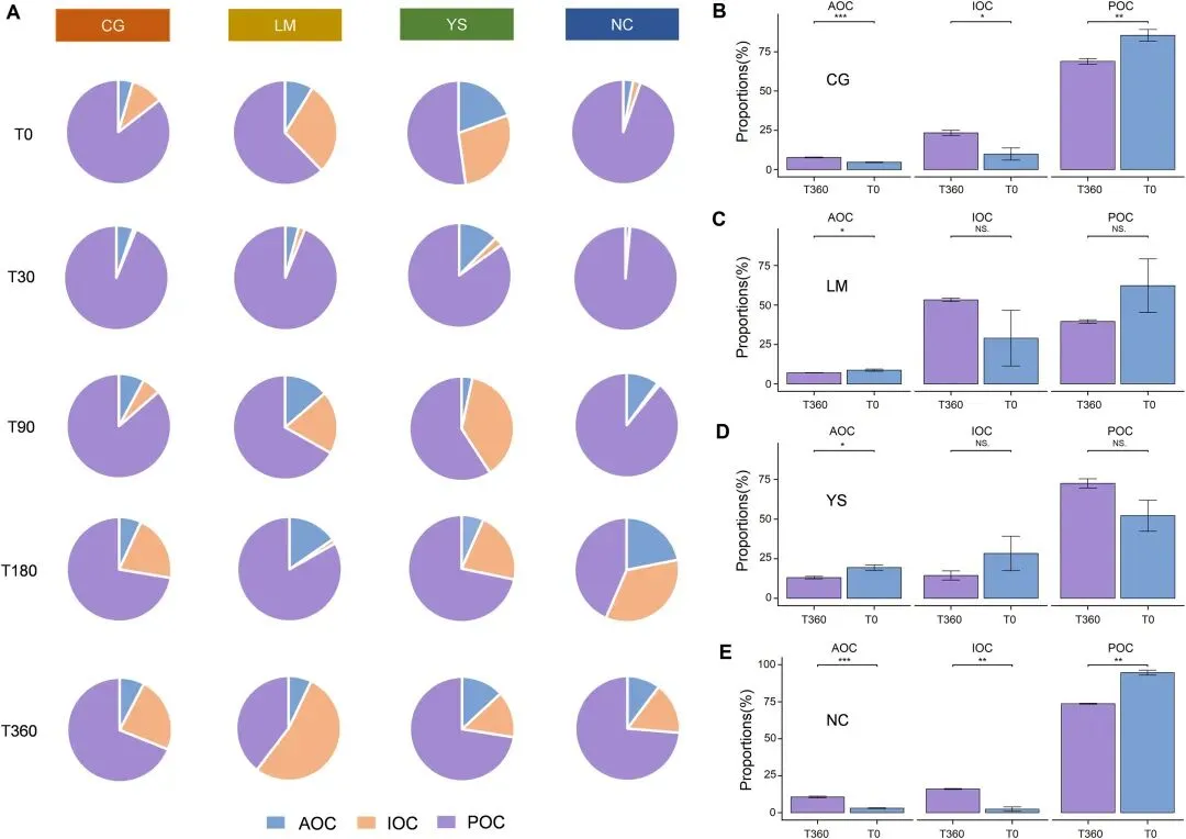 图3.不同培养阶段土壤有机碳分数的比例。A 在培养0、30、90、180和360天的四个处理中AOC、IOC和POC比例的饼图。B ~ E 在CG、LM、YS和NC处理培养前后AOC、IOC和POC比例的变异。