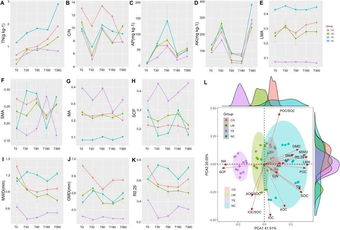 图4.不同处理方法和不同培养时间下的土壤养分和水稳定聚集体,主成分分析结果在不同处理中得出结果。A ̃ K 总氮(TN)、碳氮比(C/N)、速效磷(AP)、速效钾(AK)、各处理的大团聚体、小团聚体、微团聚体、粉黏粒、平均重量直径、几何平均直径及 >0.25 mm 粒径的水稳性团聚体含量。L CG、LM、YS 及 NC 处理所有属性的主成分分析。横轴和纵轴分别展示了四种处理在 PCA1 和 PCA2 上的边际密度曲线。缩写: LMA:大团聚体;SMA:小团聚体;MA:微团聚体;SCP:粉黏粒;MWD:平均重量直径;GMD:几何平均直径;R0.25:>0.25 mm 水稳性团聚体