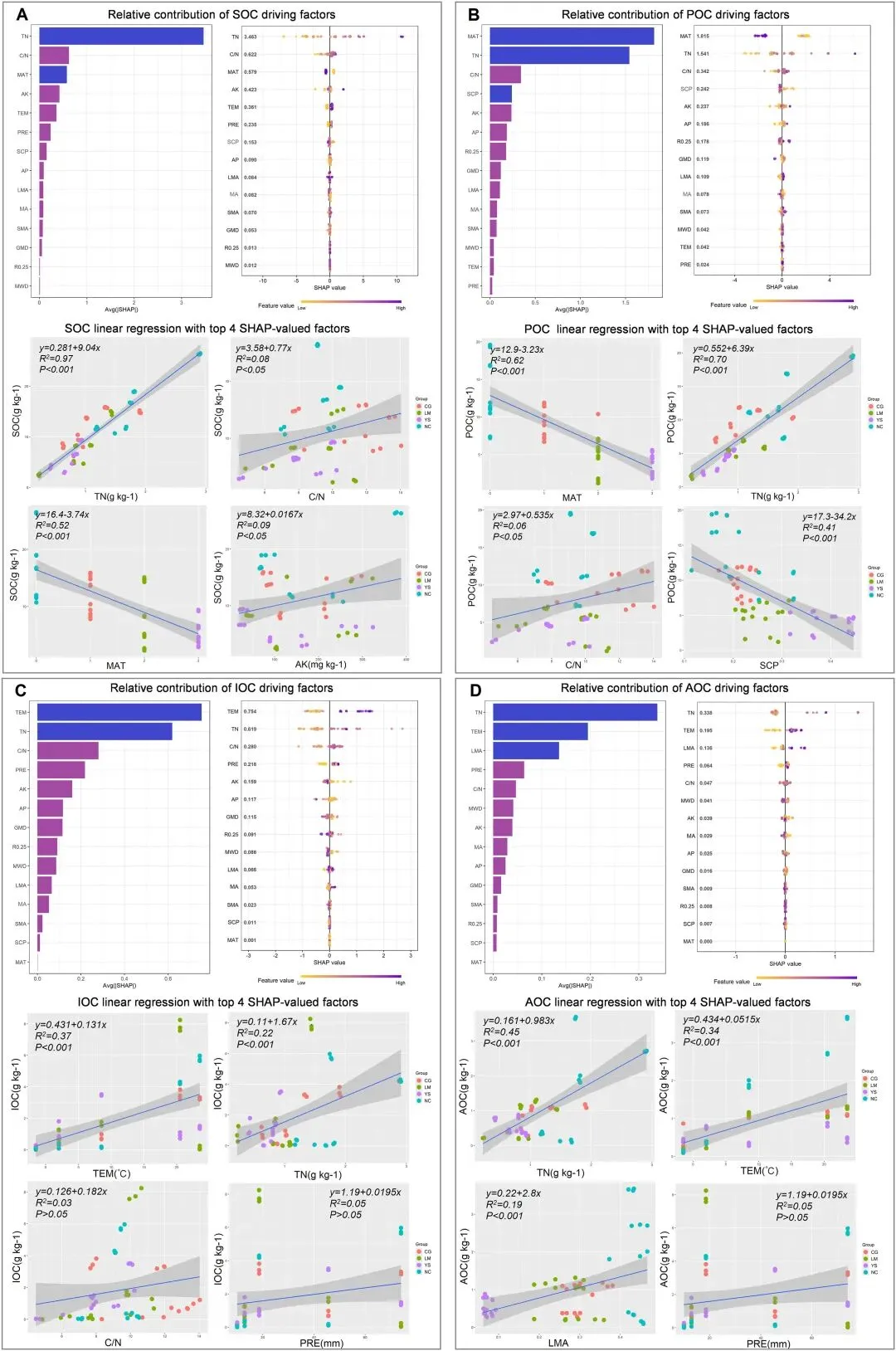 图5.SOC及其组分(POC、IOC和AOC)的驱动因素分析。利用XGBoost建模和SHAP分析分别评估环境变量对SOC(a)、POC(B)、IOC(C)和AOC(D)的重要性。选取SHAP值最高的四个环境变量进行线性回归分析,每个因变量。显示统计学显著线性关系的环境因素(P < 0.01)在SHAP值条形图中以蓝色标示。MAT:材料;TEM:温度; PRE:降水前。
