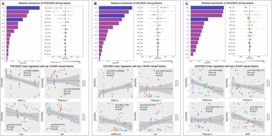 图6.SOC分数比例的驱动因素分析(POC/SOC、IOC/SOC和AOC/SOC)。利用XGBoost建模和SHAP分析分别评估POC/SOC (A)、IOC/SOC (B)、AOC/SOC (C)环境变量的重要性。选取SHAP值最高的四个环境变量进行线性回归分析,每个因变量。显示具有统计学显著线性关系的环境因素(P < 0.01)在SHAP值条形图中以蓝色标示。