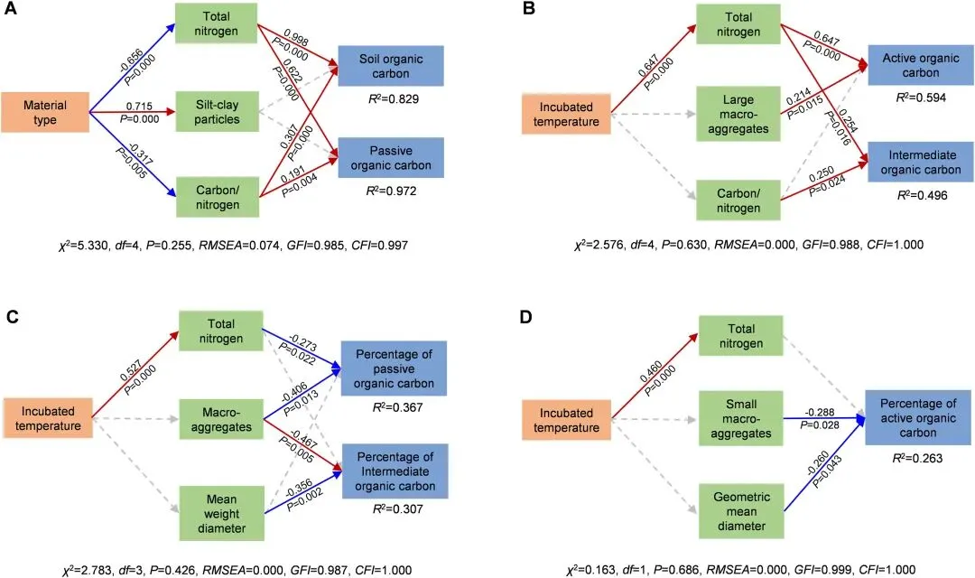 图7. 结构方程建模分析环境变量对SOC及其比例的影响。红色实线、蓝色实线和灰色虚线分别表示显著的正面效应(P < 0.05)、显著的负面效应(P < 0.05)和非显著效应(P > 0.05)。线旁的数字表示标准化的路径系数及其显著性p值。R² 代表每个因变量的解释方差比例