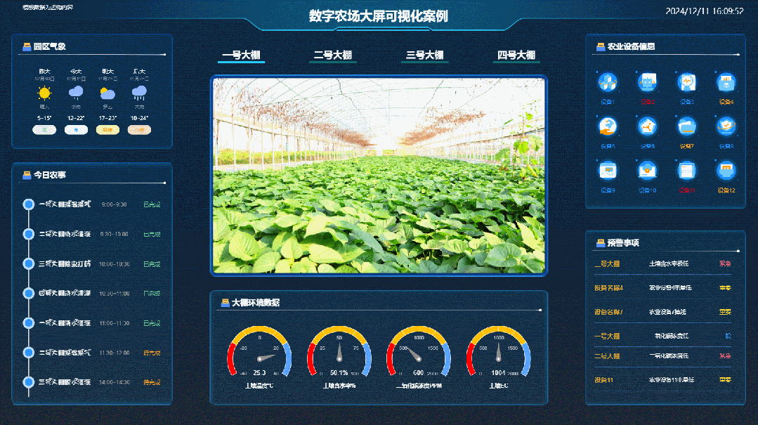 环境数据:仪表盘显示选中大棚的重点数据指标;
