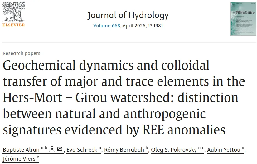 区分自然与人为地球化学信号:本研究旨在利用地球化学示踪剂和胶体分级技术,区分法国Hers-Mort-Girou流域中主要和微量元素的地球化学动态与迁移规律,明确自然地质背景与人为活动(农业和城市化)影响的各自贡献。