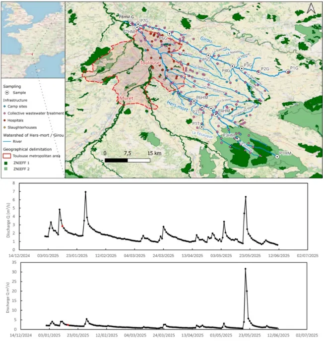 流域地球化学动态与人为影响:小型流域对人为活动高度敏感,深刻改变着元素的生物地球化学循环。这些系统位于多种环境特征的界面,其地球化学变异性源于土地利用、基岩组成和人为输入等多种来源,生态连续性和地球化学动态难以预测。农业扩张和城市化改变了景观和水文参数,加剧了地表径流和土壤侵蚀,导致元素持续输入河流,显著改变了流域的水文地球化学质量。尽管已有研究关注主要阴阳离子负荷及其在土壤退化中的作用,但过去数十年间区域人口大幅增长和人为活动密集化意味着当前元素负荷可能已发生深刻变化。水生环境中元素的迁移通常以溶解相和颗粒相来描述,然而胶体物质在金属和类金属的迁移中扮演重要角色。胶体对温度、离子强度、氧化还原电位和微生物活动等物理化学条件敏感,影响其聚集、组成和反应性,使其成为水生系统中重金属动态的有用指标。然而,在小型自然流域中,胶体相的行为,特别是有机胶体物质在控制元素活性和迁移方面的作用,以及沿河流连续体尺寸分布的演变,尤其在温带非污染环境中,基线过程仍未得到充分探索。潜在有害元素(PHEs)包括重金属,可能来源于自然过程(如基岩风化),也可能来源于人为源,如工业排放、污水处理厂出水以及农业肥料和农药的使用。高浓度时对人类健康和生态系统构成重大风险。由于其双重来源,PHEs越来越多地被用作河流和城郊环境人为压力的指标。除了PHEs研究,为了改善对元素迁移来源(自然与人为)和过程的理解,特别是溶解相和颗粒相之间的分配,稀土元素(REE)已被广泛用作重要的环境指标。REE的分布模式对地质基底和溶液或表面的络合过程特别敏感,因此能提供元素迁移方式的信息。近几十年来,由于技术、医疗和工业领域的需求增长,REE的使用大幅扩展。其中,钆(Gd)异常通常与人为源相关,特别是在医疗成像中作为MRI造影剂广泛使用。Gd与有机配体形成高度稳定的化合物,在常规污水处理过程中难以去除,已成为水生系统中人为污染的标志性示踪剂。然而,据我们所知,Gd异常仅在整体溶解相中进行过研究,迄今为止尚未有研究考察其在河流水体不同物理组分(特别是真溶解池)中的分布,也未考察其作为人类活动示踪剂的潜在作用,这凸显了当前研究的重要贡献。Gd来自MRI过程,不具有颗粒反应性,且专门分配在真溶解组分中。因此,在像Hers-Mort-Girou这样的小型流域中,首次在所谓实际溶解相(<3 kDa)中计算Gd异常,有助于同时考虑异常(人为)输入以及由于其更小尺寸和更高潜在反应性而对公共健康产生的潜在更强影响。这一知识缺口限制了对人为活动如何通过胶体途径影响微量元素迁移和生物有效性的理解,特别是在承受高强度农业和城市扩散压力的温带小流域中。